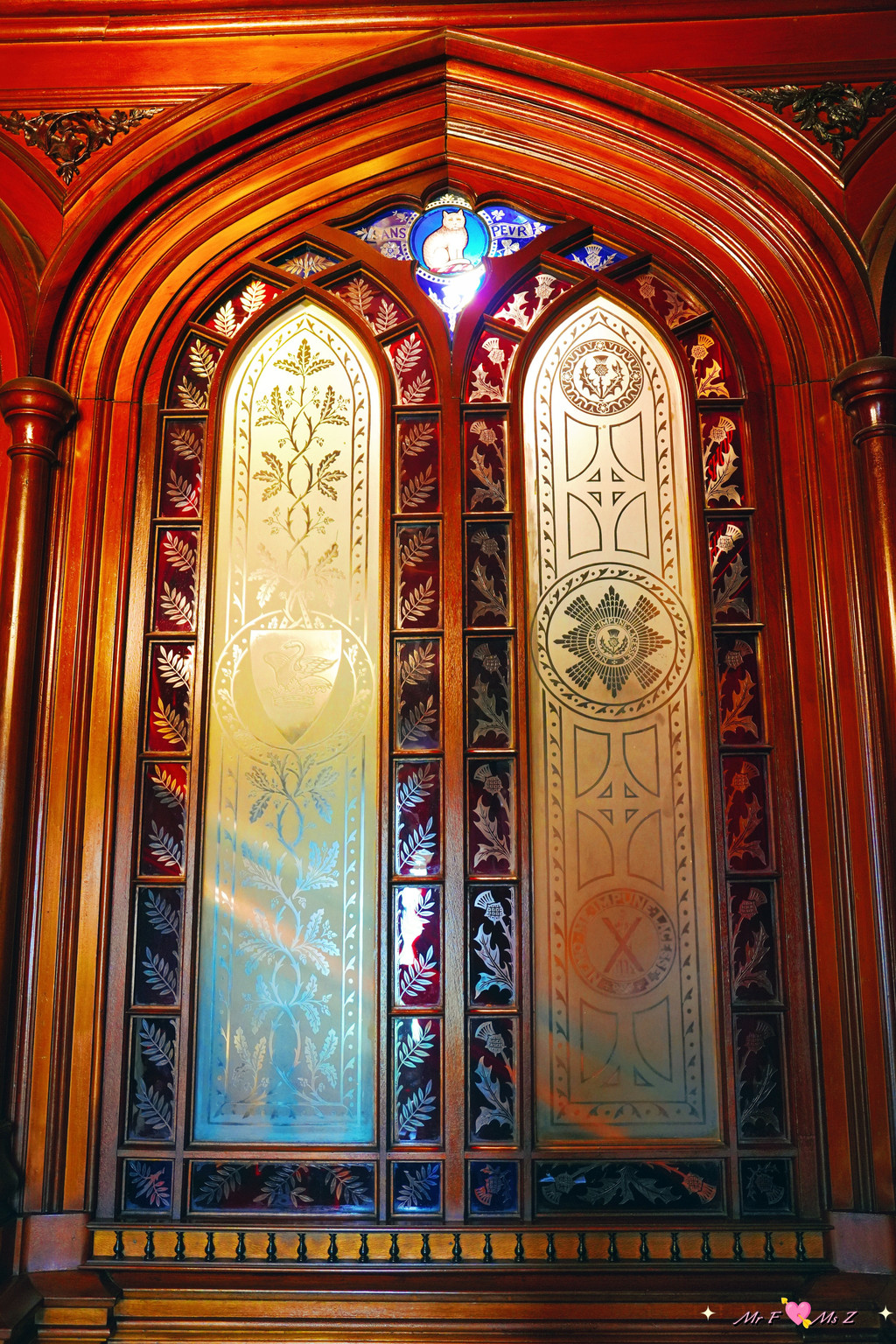步入前厅,映入眼帘的是一块巨大的手工蚀刻的威尼斯玻璃(Venetian Glass)。玻璃上细腻地刻画着英格兰的玫瑰、爱尔兰的三叶草、威尔士的花楸树以及苏格兰的蓟。考虑到拉纳克家族来自苏格兰,这些图案不仅象征着英国,也寄托了城堡主人对故土的思念。