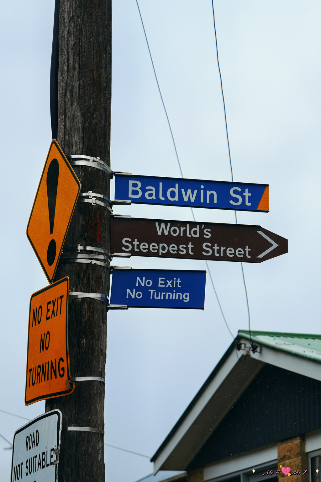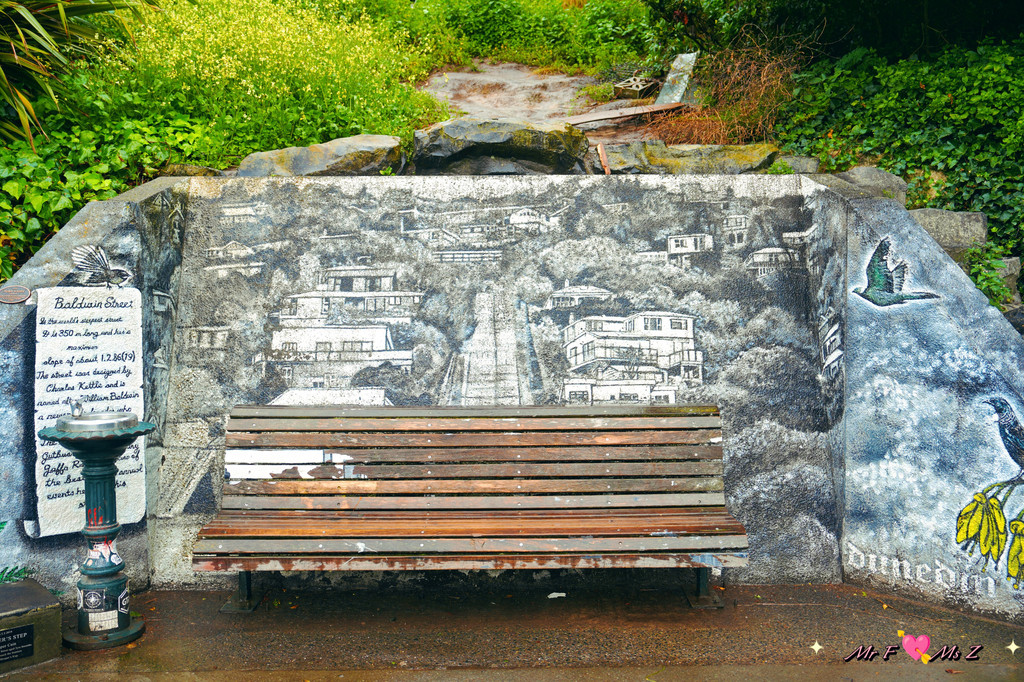 这种距离的登顶对我来说并不算太难。终点处有一面石壁,上面绘制了周边的风貌以及鲍德温大街的介绍。石壁前还贴心地为游客准备了一张长椅,累了可以在此稍作休息,既能恢复体力,又能俯瞰但尼丁的美景。