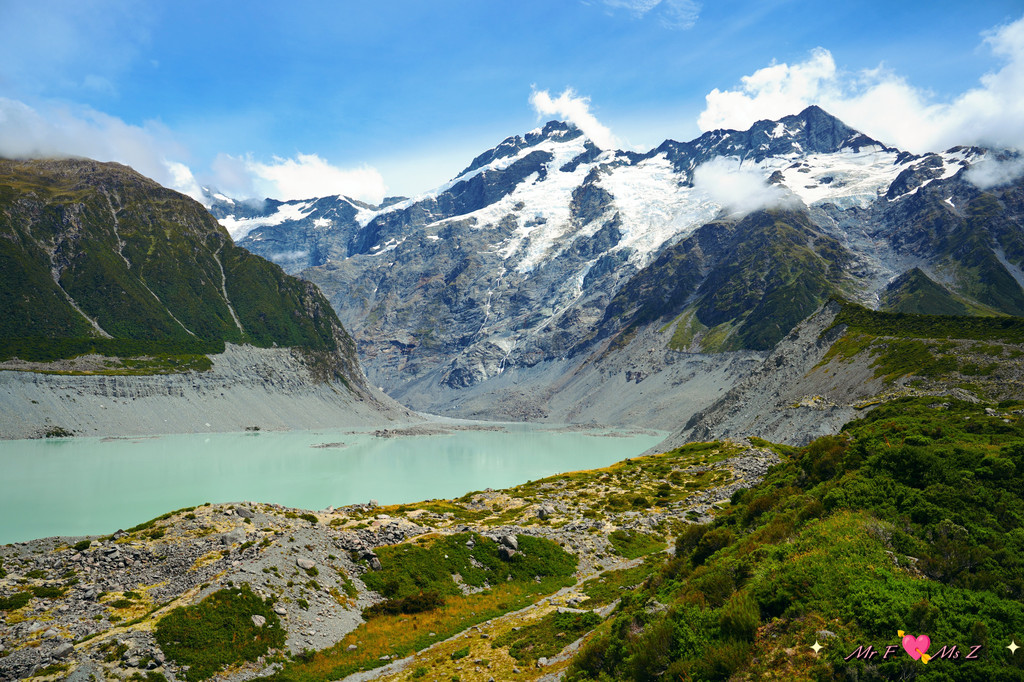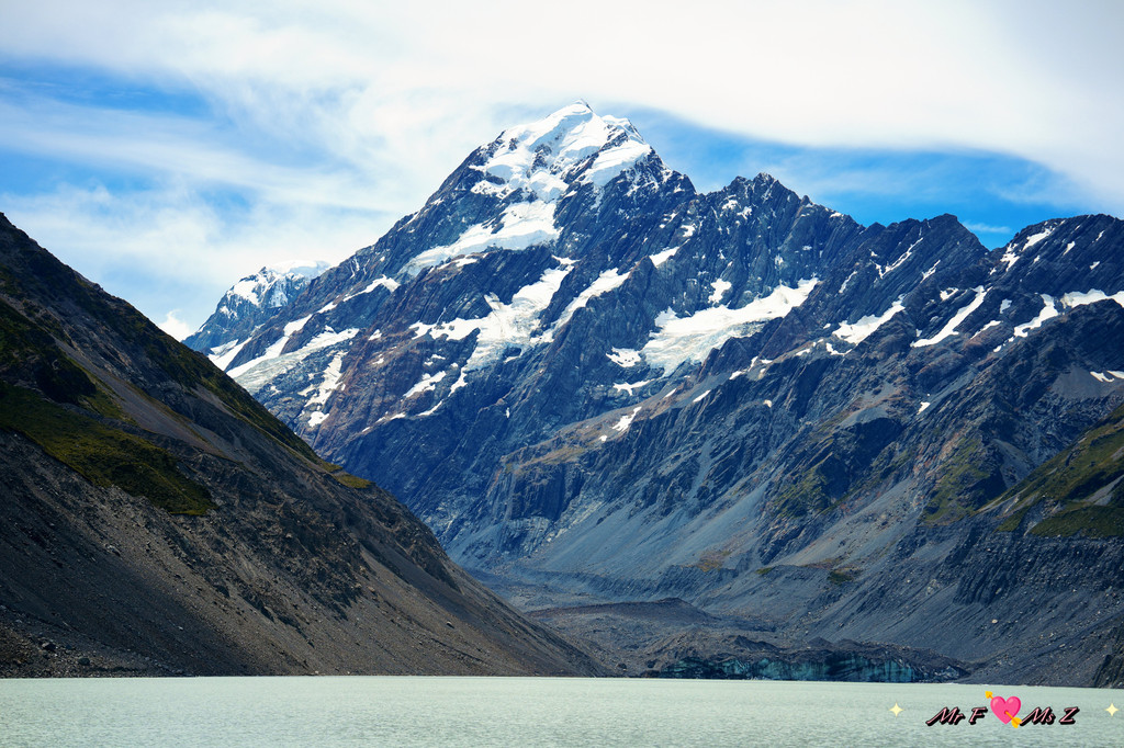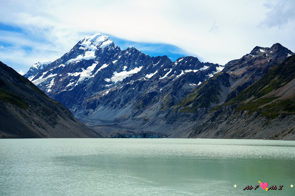 作为公认的普卡基湖的CP,远方高耸的库克山犹如一把雪白的利剑,直指苍穹,与湖水相映成趣。