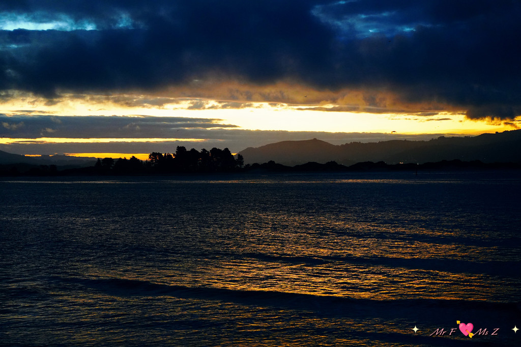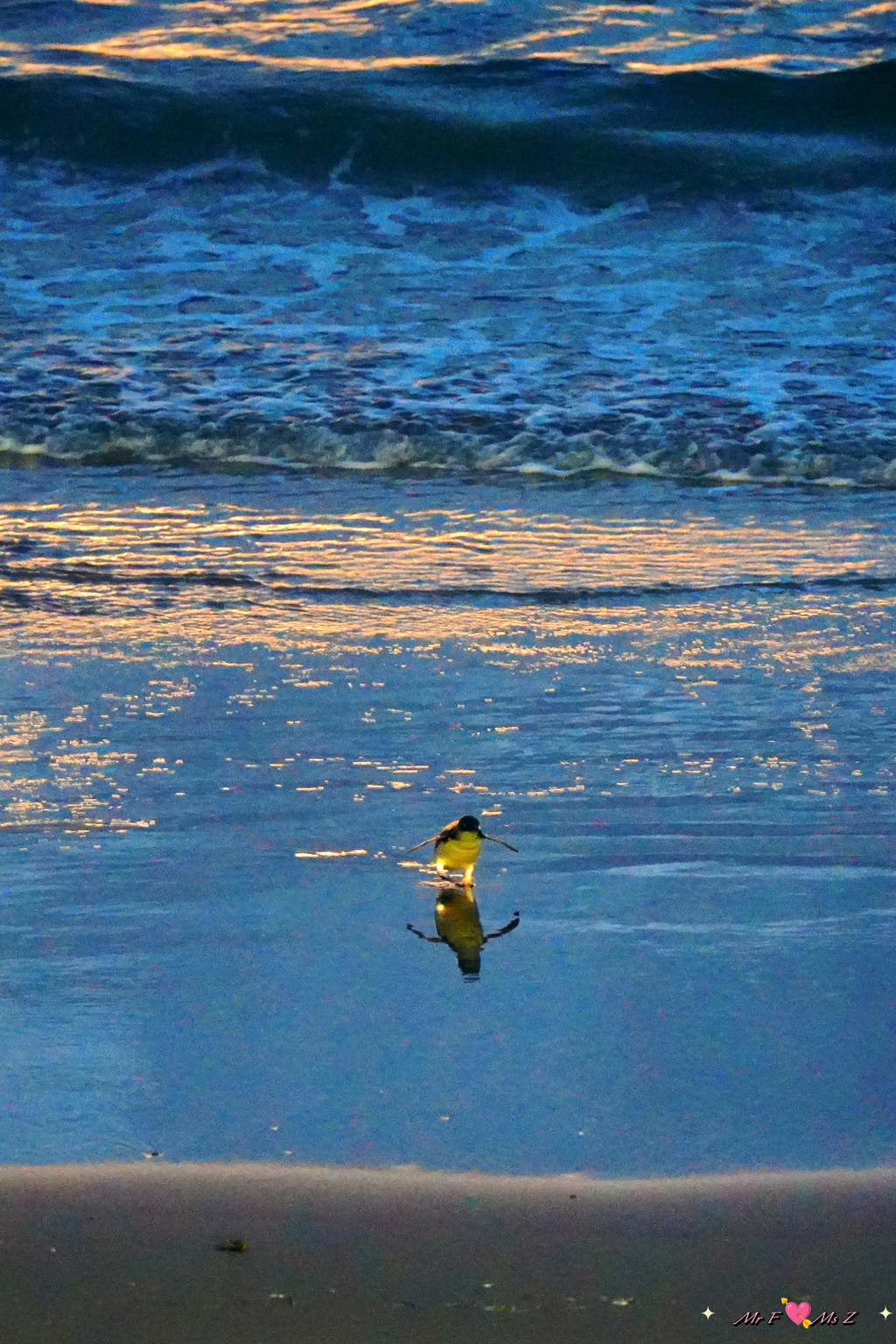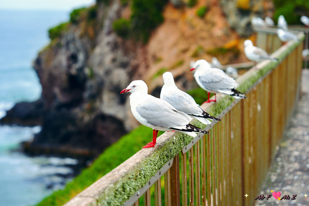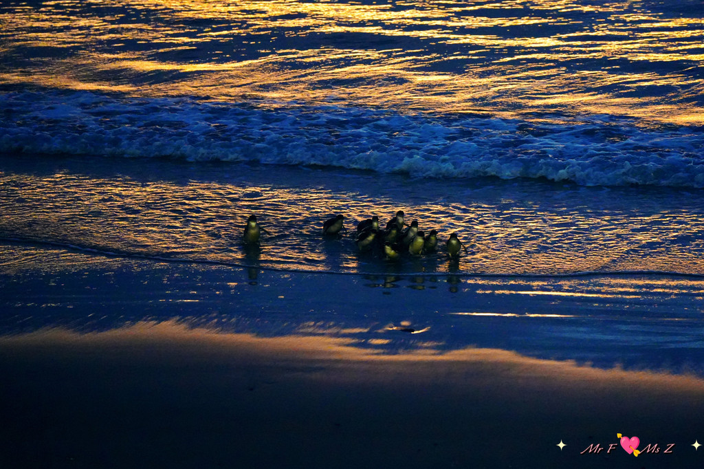 台阶的尽头有一座木制观景台,正前方是平静的大海,左侧紧邻蓝企鹅归家的通道。此时,太阳已躲到山的后面,天际染上了一抹淡淡的金黄,夕阳的余晖轻柔地洒在海面上。所有人都翘首以盼,准备迎接一场无声的仪式。