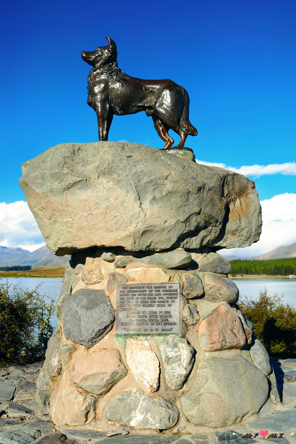 距离教堂几步之遥有一座“牧羊犬纪念碑(Sheepdog Memorial)”,这座青铜雕像是为了纪念那些在新西兰畜牧业历史中默默奉献的牧羊犬而建立的。底座上刻着一段铭文,表达了新西兰人对这些勤劳伙伴的敬意与感激之情:“没有牧羊犬的帮助,在这个以山地为主的国家,放牧将变得难以实现。”