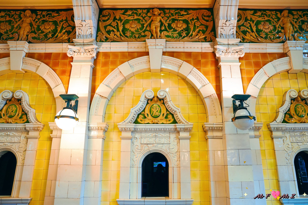 步入站内,一层的大部分区域已改成饭店,二层则是美术馆和体育名人纪念馆。 即便如此,我还是被内部的华丽装饰所震撼。马赛克地板上的图案精致细腻,彩绘玻璃窗透进微弱的光线,站内的木质长椅和复古的售票窗口,让人仿佛穿越回了百年前的时光。