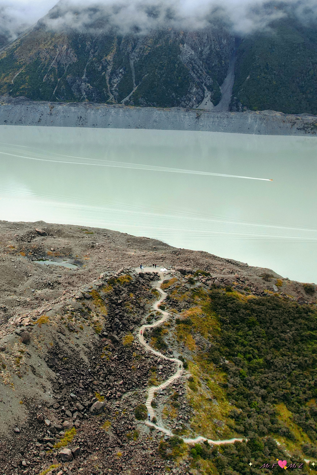 这条步道如同一段穿越时空的旅程:起初,它蜿蜒穿过一片静谧的森林,树影婆娑;随后,小径缓缓攀升,延伸至历史悠久、两侧荆豆丛生的摆渡者小道(Ferryman’s Track),两旁是冰川与河流冲刷而成的梯田。