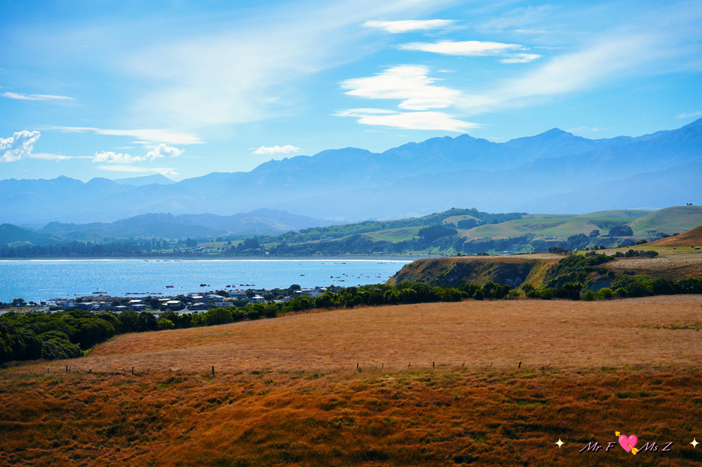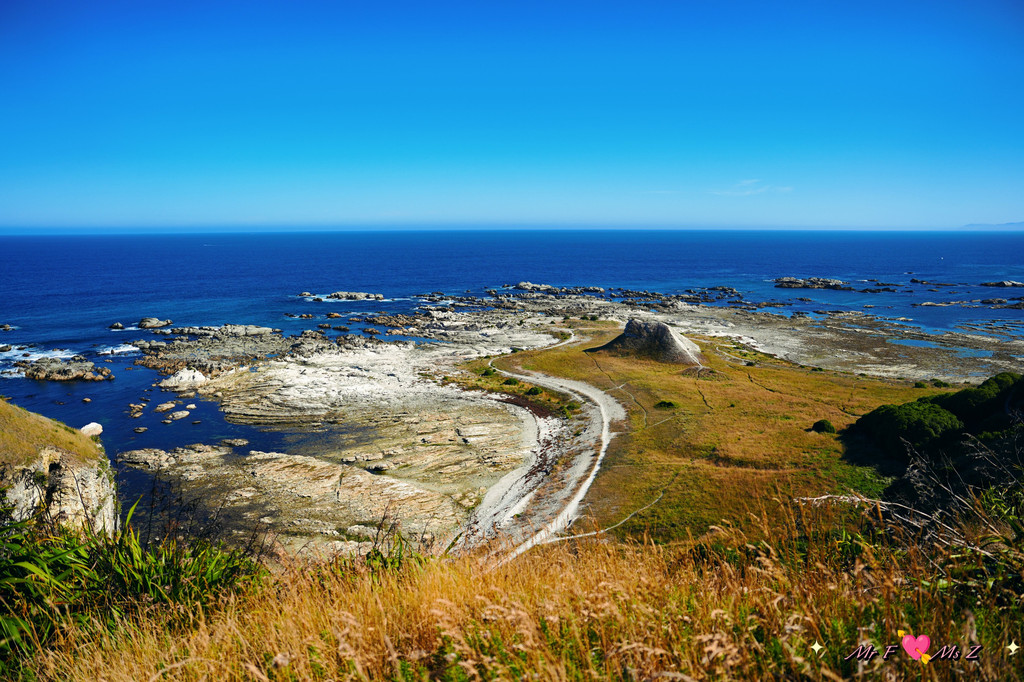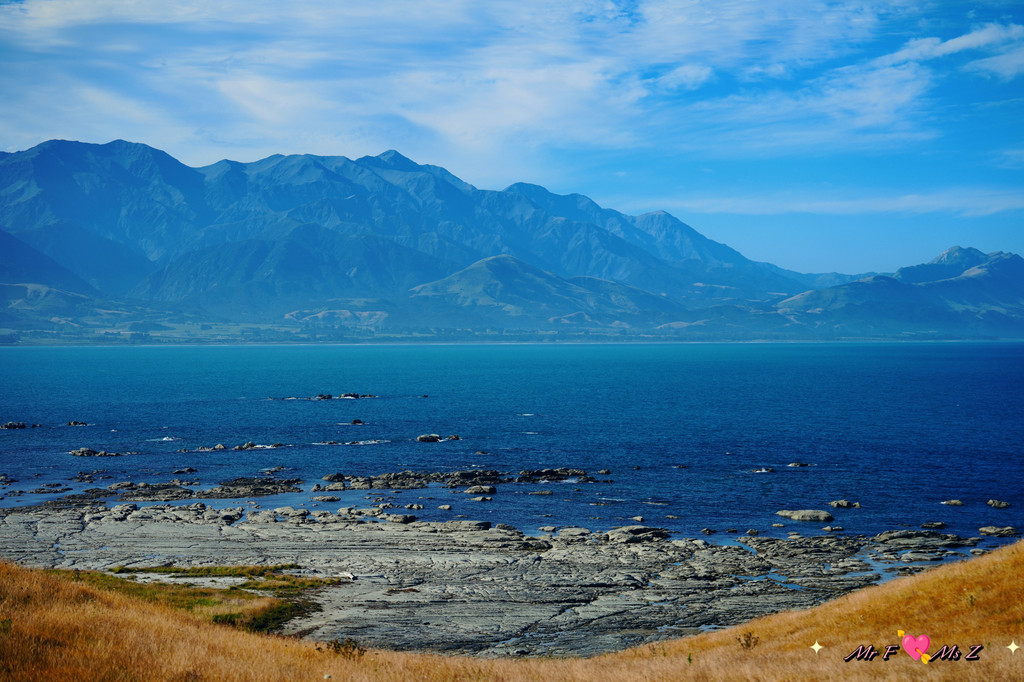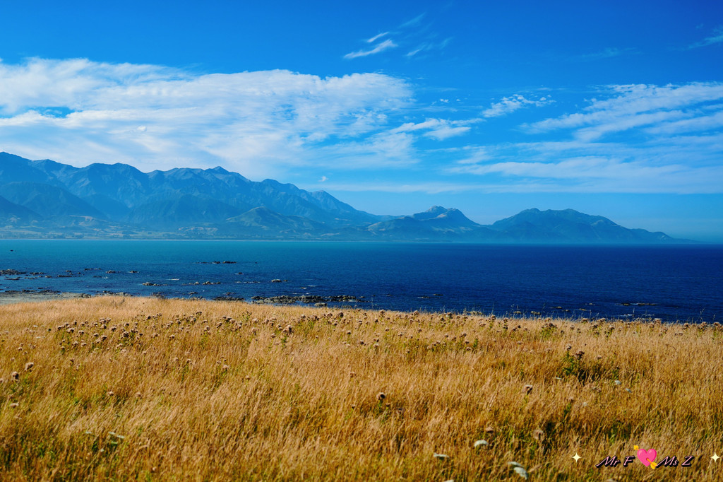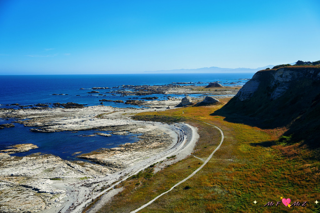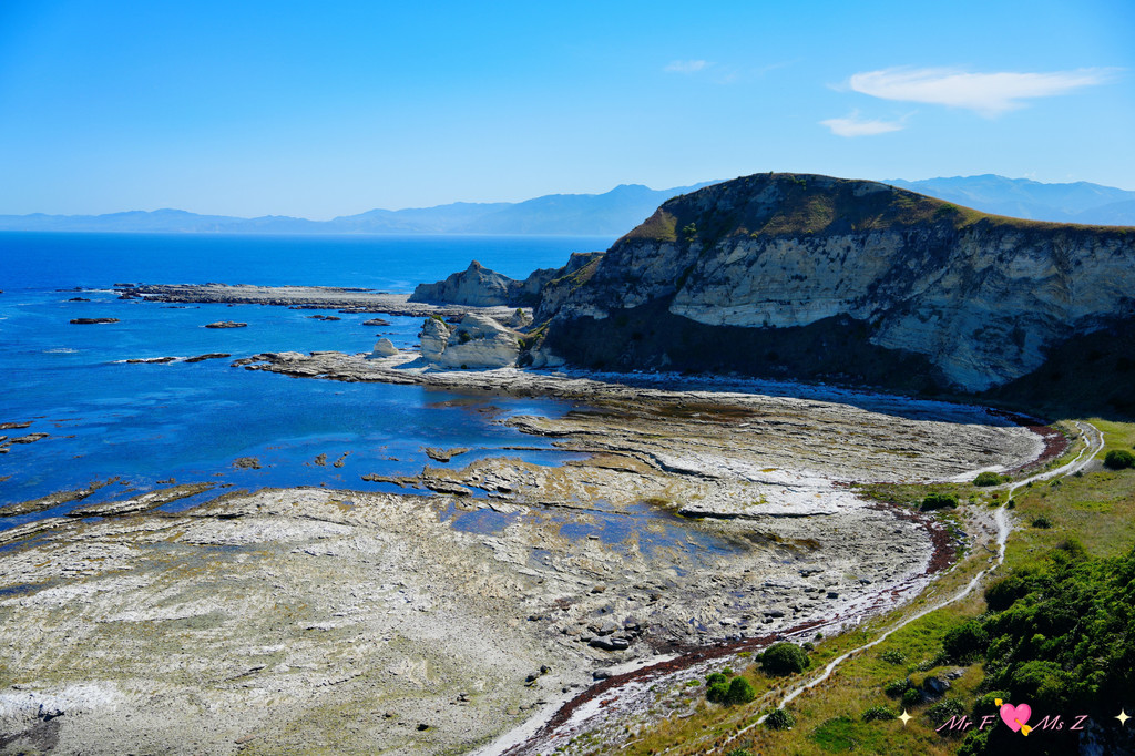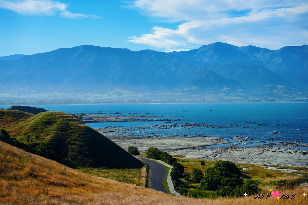 步道随着山势起伏,眼前的景色也随之豁然开朗。向西眺望,凯库拉山脉如巨人般巍峨矗立,默默俯视着这片海域。