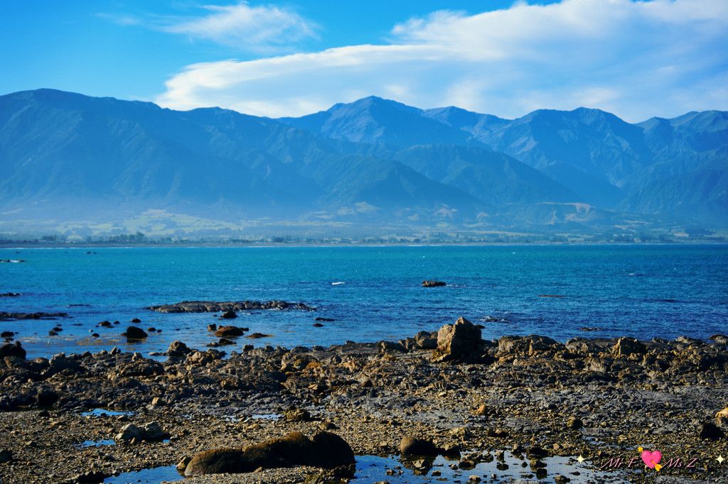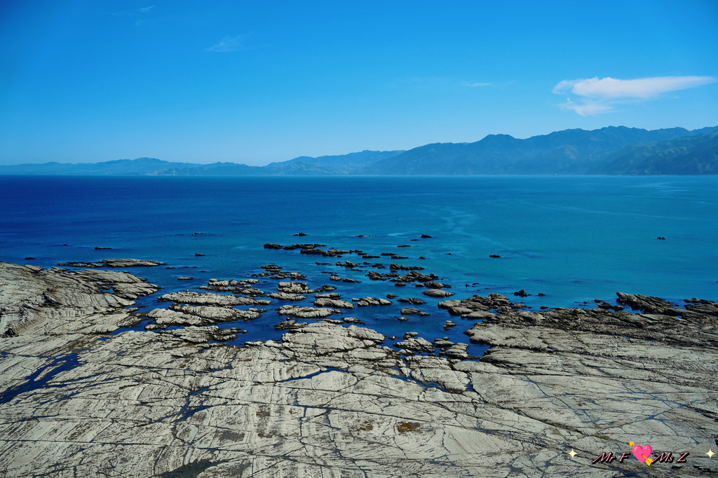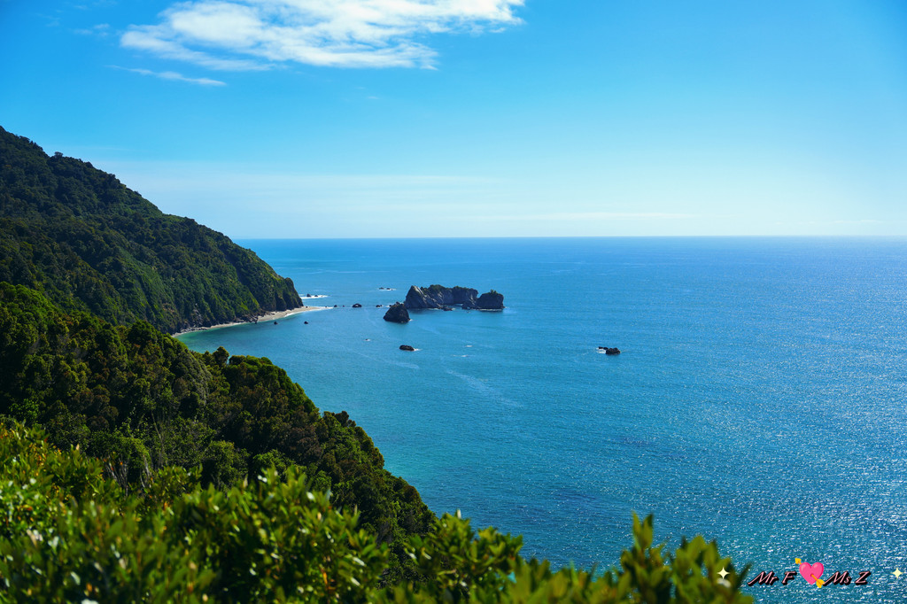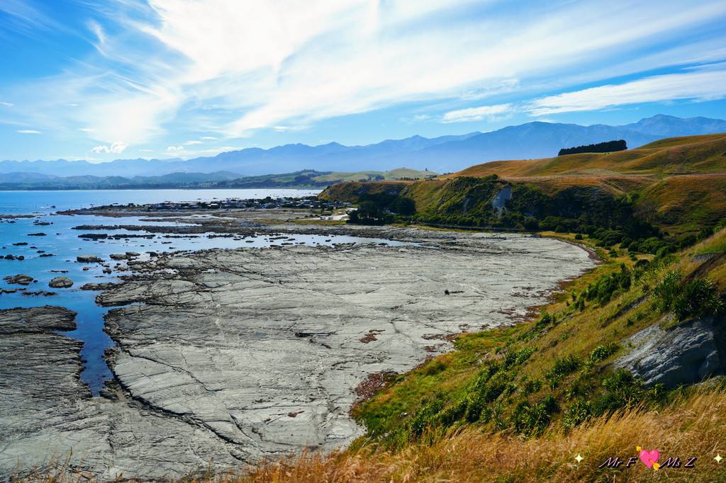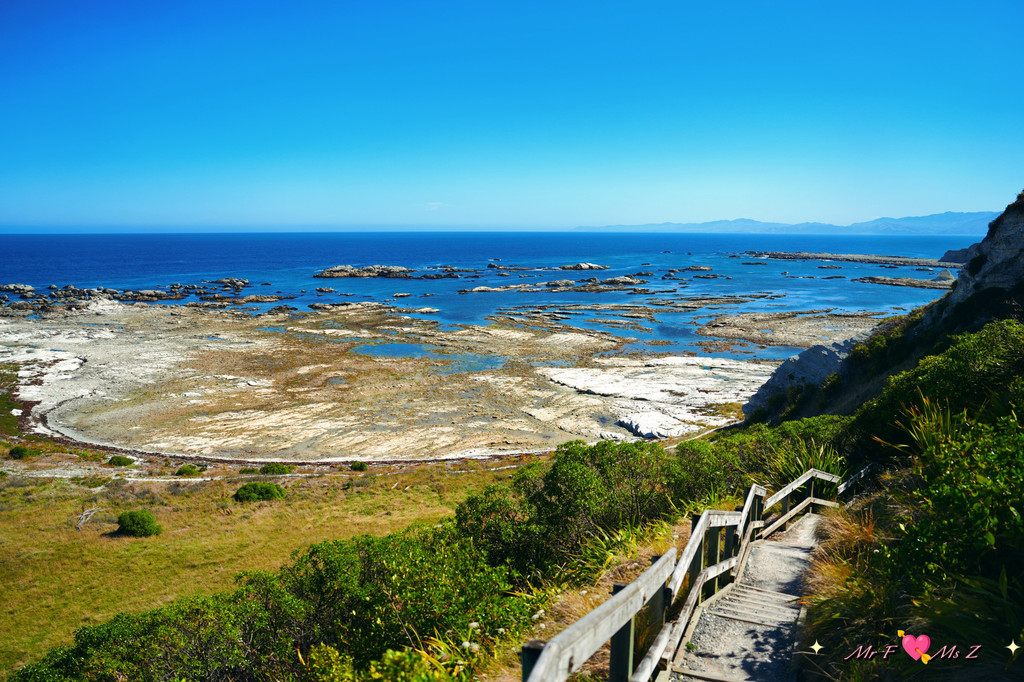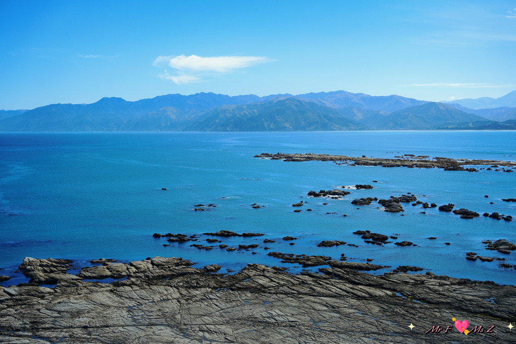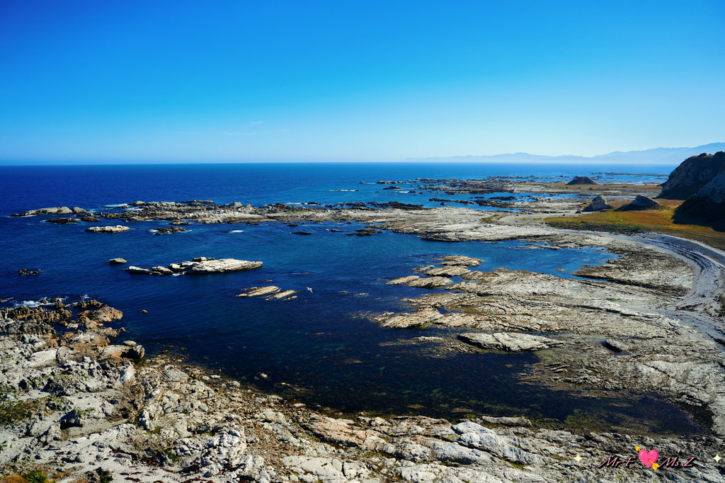 步道随着山势起伏,眼前的景色也随之豁然开朗。向西眺望,凯库拉山脉如巨人般巍峨矗立,默默俯视着这片海域。