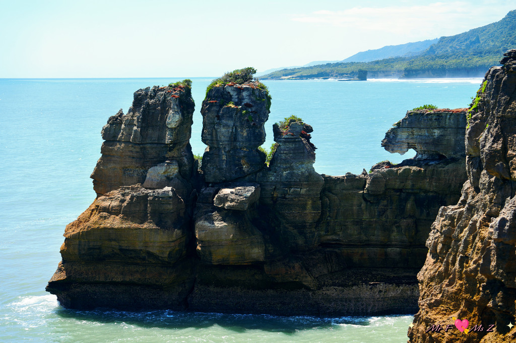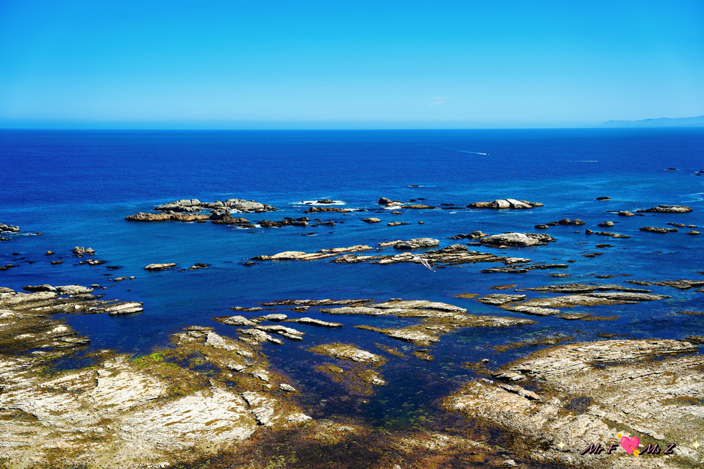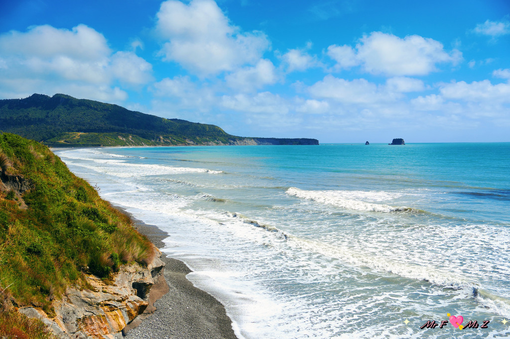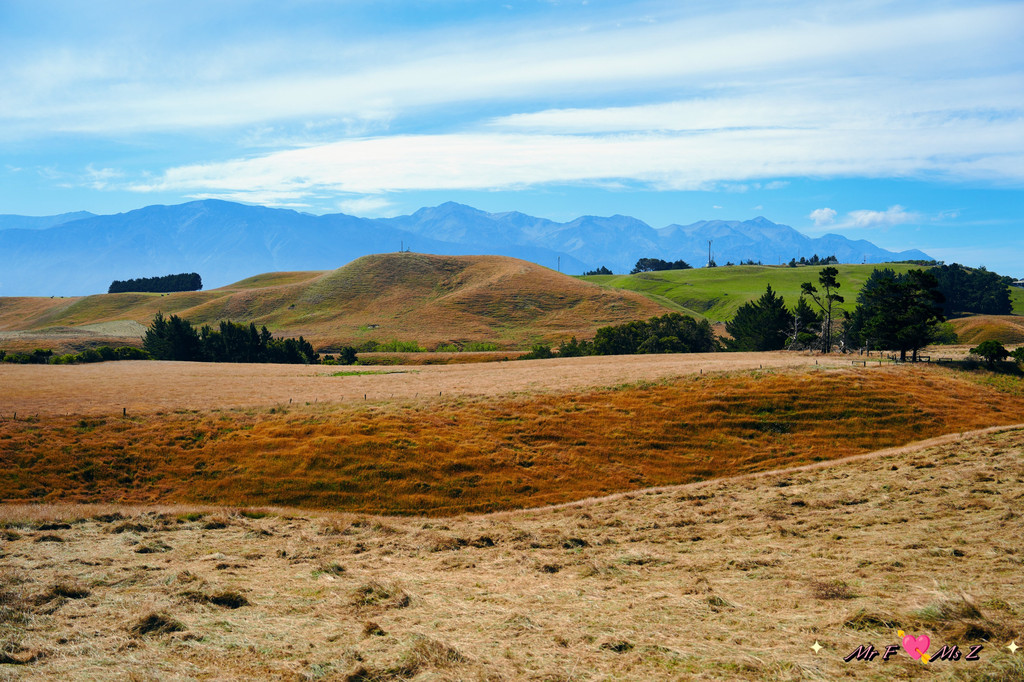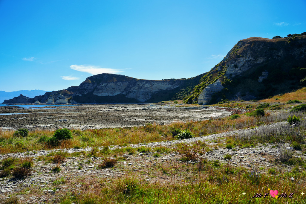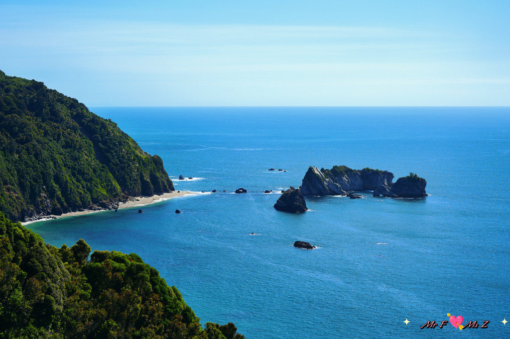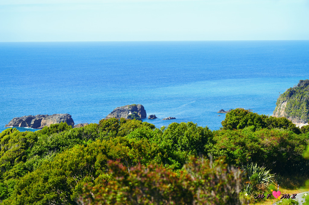 步道随着山势起伏,眼前的景色也随之豁然开朗。向西眺望,凯库拉山脉如巨人般巍峨矗立,默默俯视着这片海域。