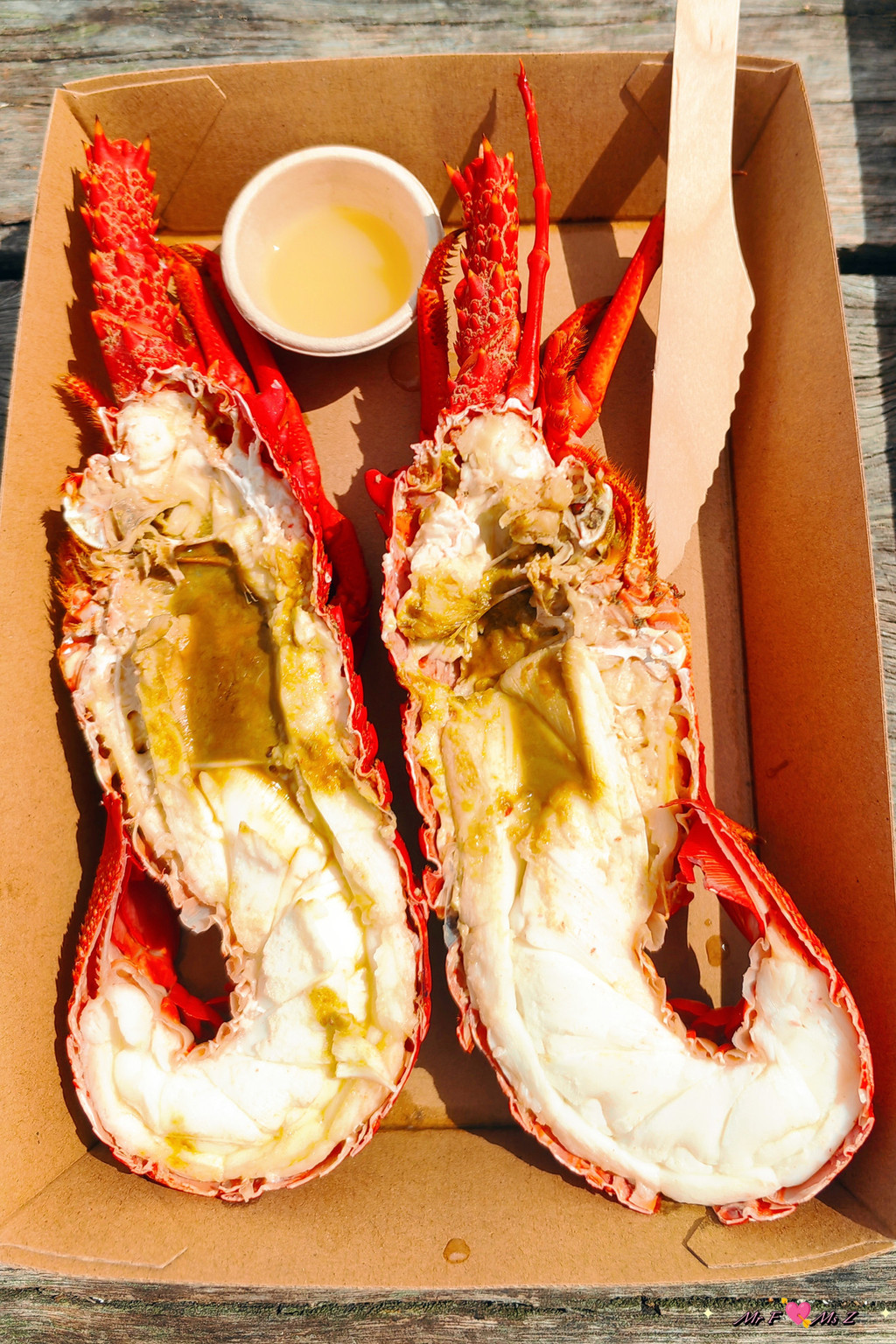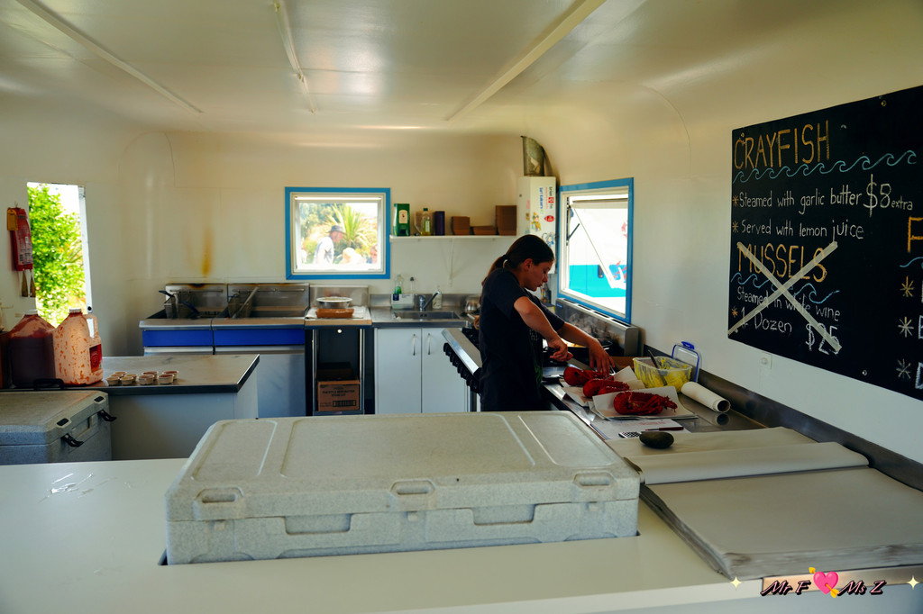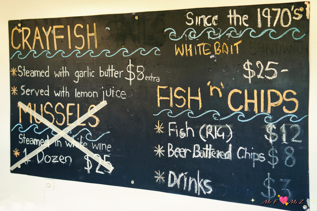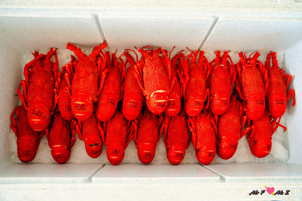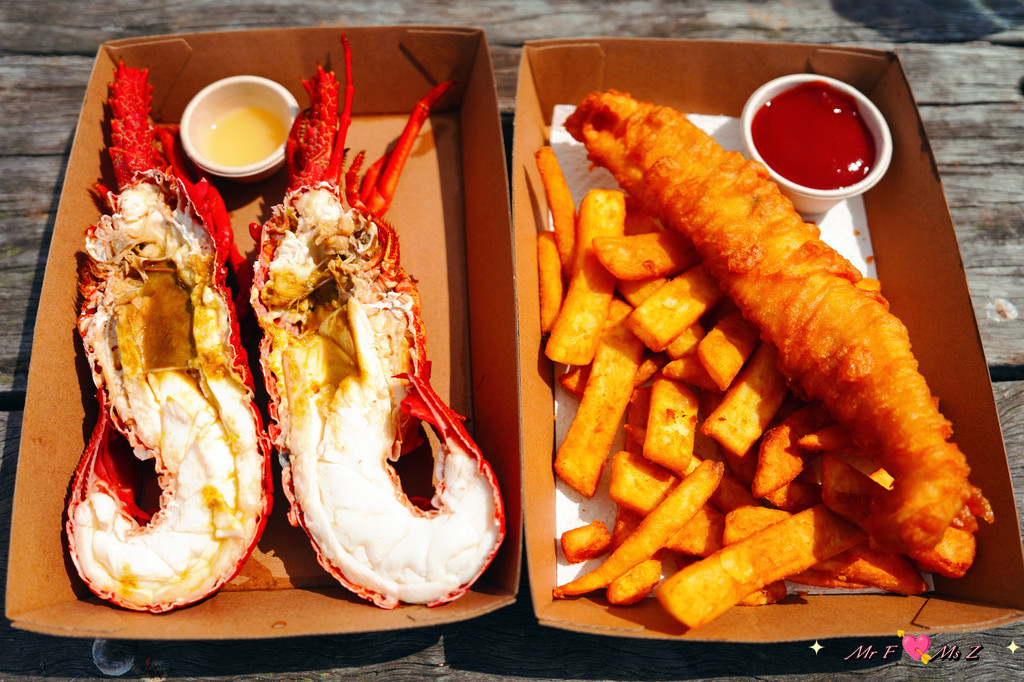 二、龙虾按重量计价,每只的价格大约在100-150纽币之间,背部甲壳上黑色水笔标注的数字即为价格。龙虾均为现做,肉质鲜甜,推荐蒜香黄油做法,但需额外付费。除了龙虾,这里的贻贝和炸鱼薯条也是不错的选择。