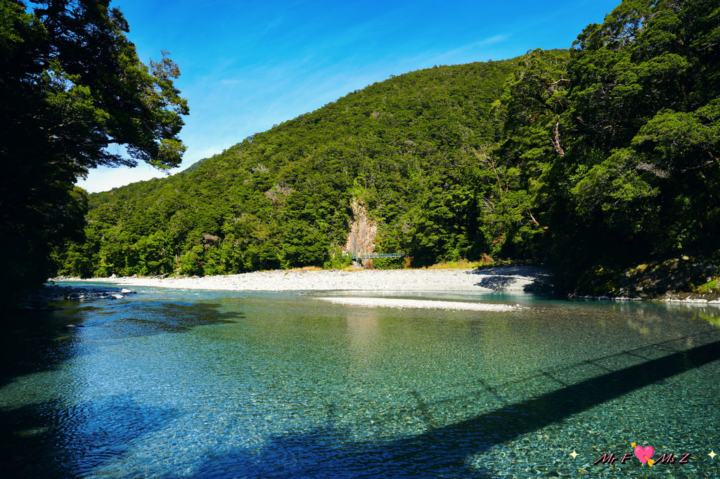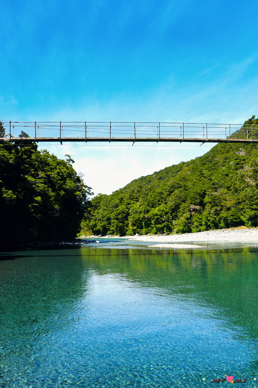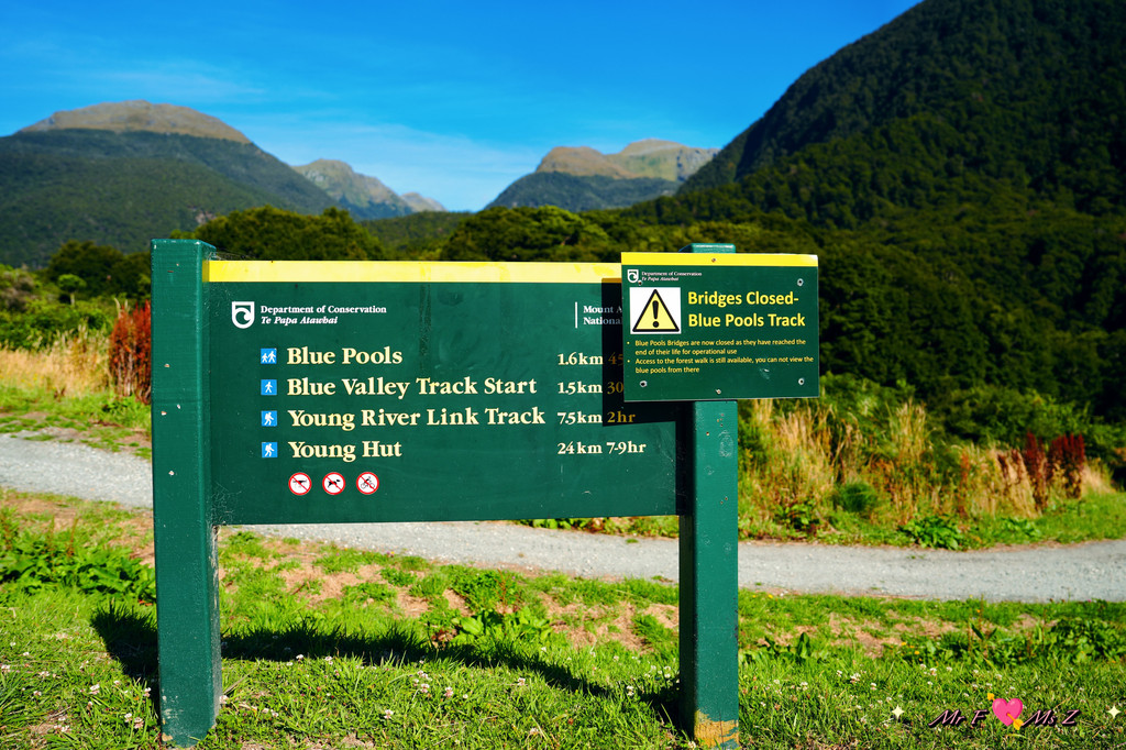 驶过马卡罗拉不久,公路旁便隐藏着阿斯帕林国家公园内最惊艳的短途步道——蓝池步道(Blue Pools Track)。步道的尽头,两座吊桥横跨于“新西兰最纯净水域”之上,桥下是一泓被马卡罗拉河(Makarora River)与蓝河(Blue River)共同滋养的天然深池。