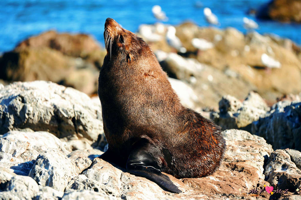 新西兰毛皮海豹,虽然名字里有“海豹”二字,实际上属于海狮科,也被称为“海狗”。它们长着尖尖的鼻子和苍白的胡须,有着明显的外耳瓣和向前旋转的后鳍,这使得它们能够在陆地上相对快速地移动。