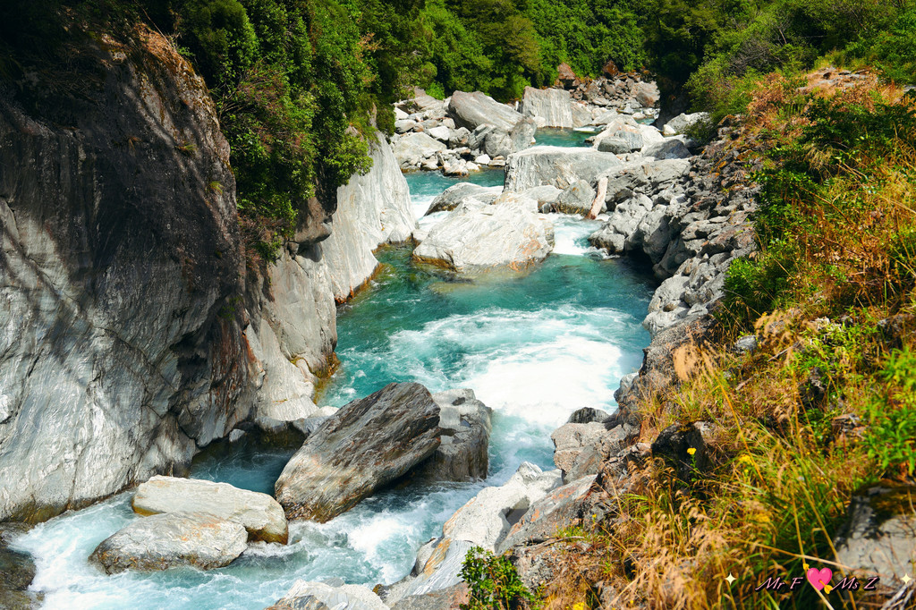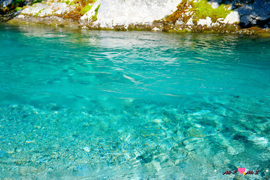 十分钟后答案揭晓。双河交汇处,蓝到令人心悸的池水,如天神遗落的蓝宝石般洒落在峡谷之中。