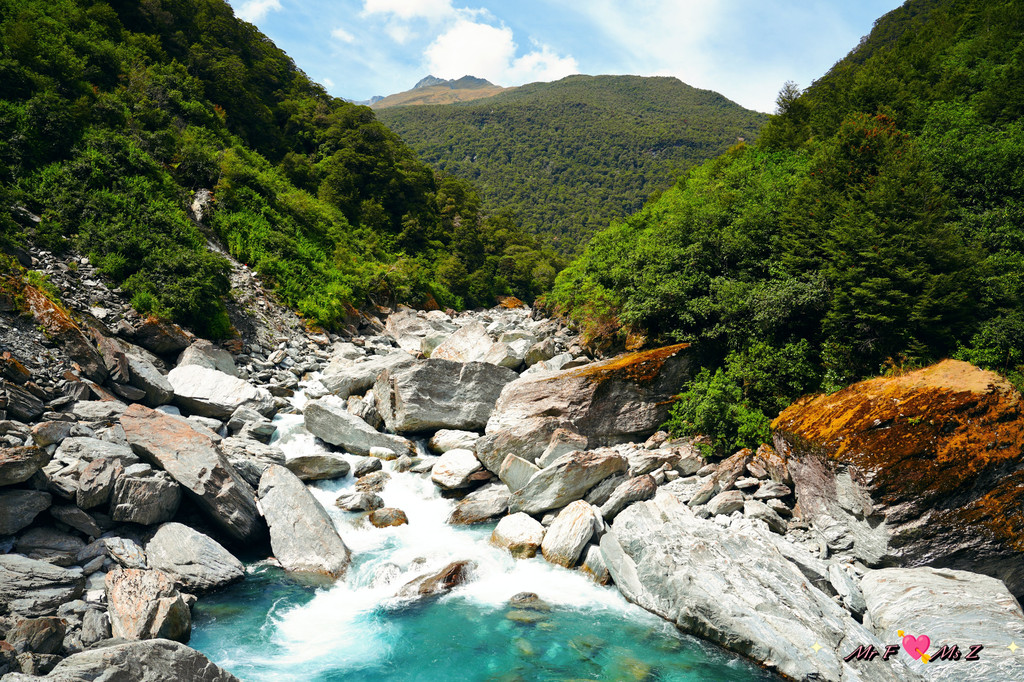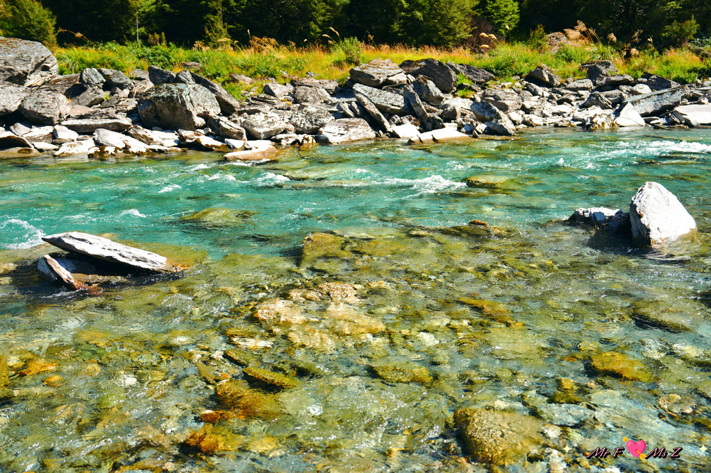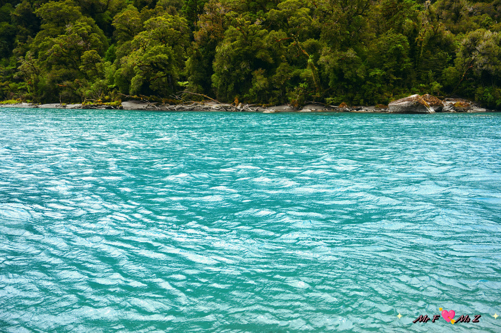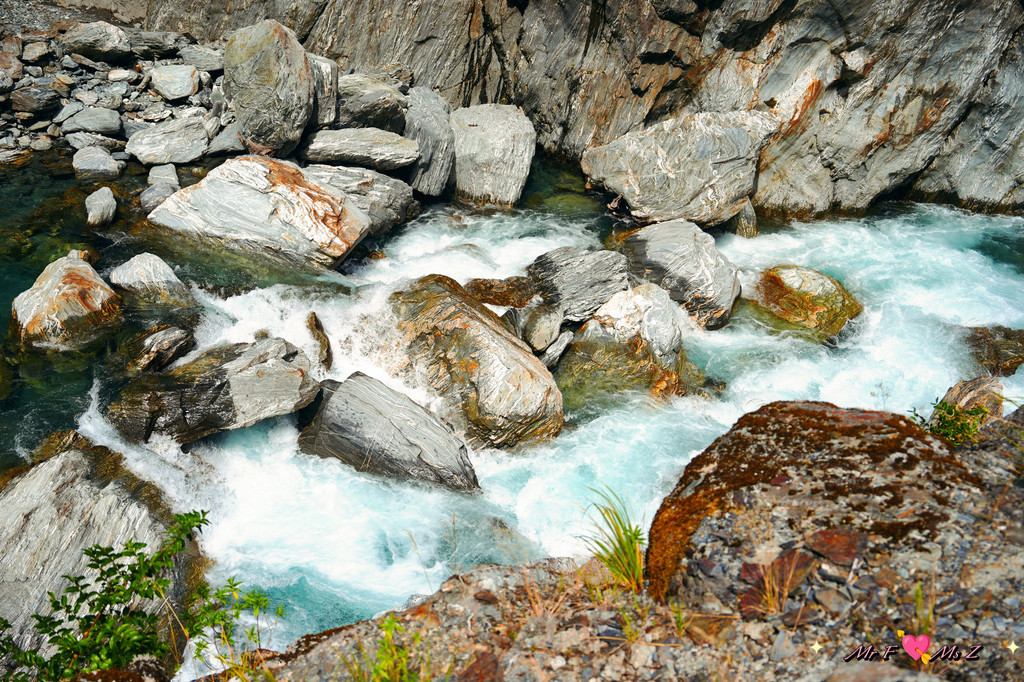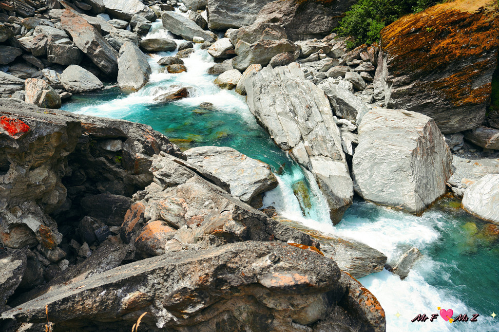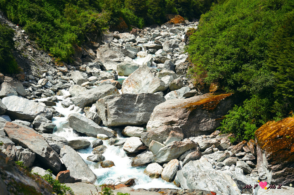 冰川融水在岩石间欢跃,将整条河床染成流动的翡翠,粼粼波光里倒映着南阿尔卑斯山终年不化的雪冠。