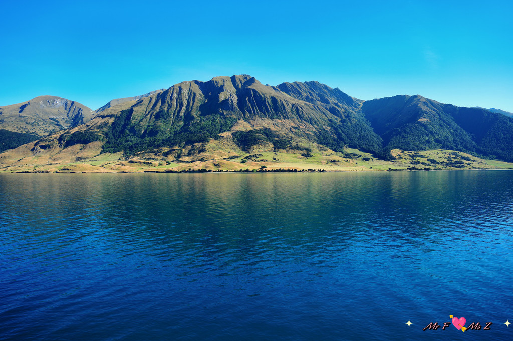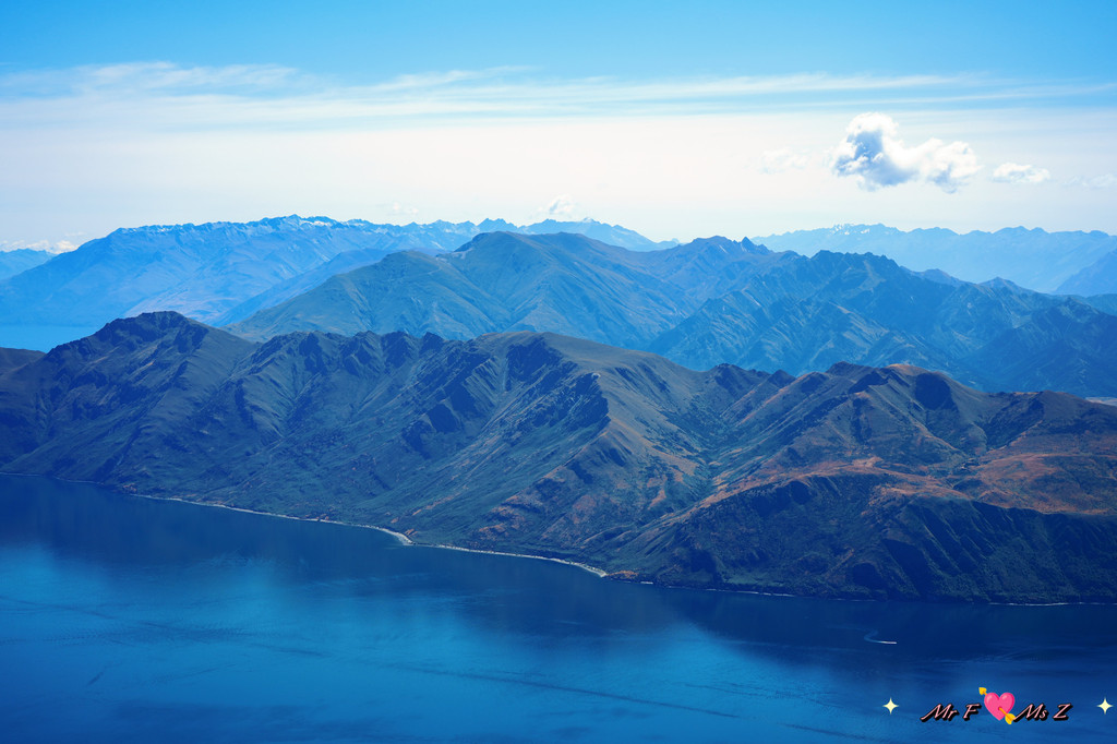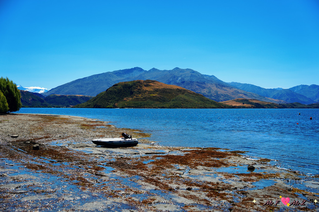 脚下,瓦纳卡湖宛如一面巨大的镜子,平静而深邃。湖面上偶尔有游船驶过,仿佛一支蘸满颜料的画笔,在湛蓝的绸缎上拖曳出长长的白色尾迹,转瞬又被湖水温柔地抚平。