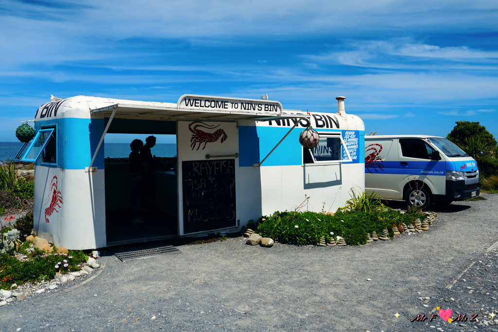 我从基督城向北驱车两小时余,抵达凯库拉时已过正午。饥肠辘辘的我决定暂缓海豹半岛的行程,继续沿1号公路北行觅食。约二十分钟后,路边一抹天蓝色的身影倏然跃入眼帘——Nin’s Bin餐车犹如被潮汐遗忘的珍宝,静静栖身于公路与礁石交界的狭长地带。