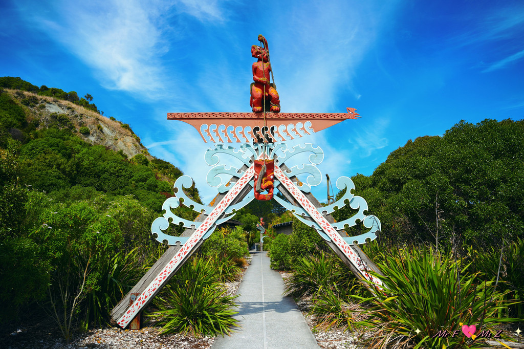 下午3点,阳光温柔地洒在半岛上,我准时从徒步的起点——南湾停车场出发,步道入口处矗立着一尊毛利人捕鱼的雕像,象征着这片物产丰饶的土地承载了逾800年的毛利文明史。早期的毛利先民曾在此捕猎恐鸟(Moa),栖身海岸洞穴。随着恐鸟数量的减少,农耕逐渐成为毛利人的主要生活方式。如今,恩盖塔胡部落(Ngai Tahu)仍聚居在镇上的塔卡汉加会堂(Takahanga Marae)。