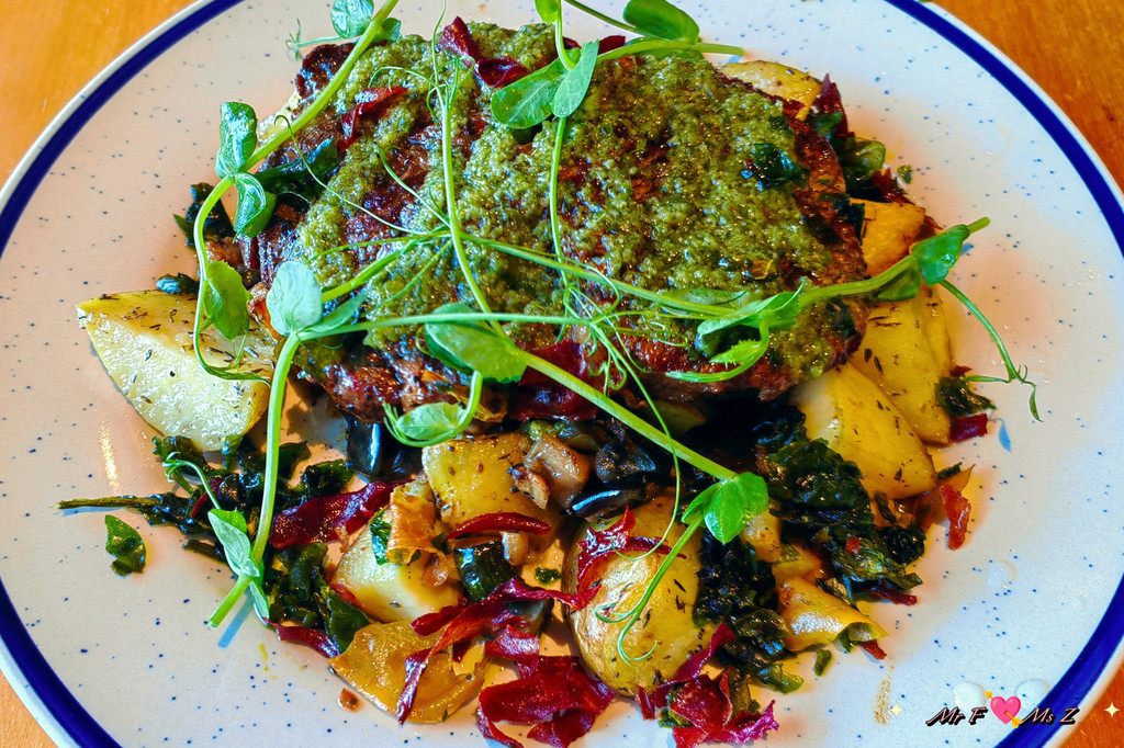哈威亚湖畔小镇不似瓦纳卡那般热闹,餐厅也屈指可数。暮色渐沉时,我们索性就在酒店餐厅享用晚餐。来了这么多天,还未尝试过新西兰最负盛名的牛排。目光在菜单上游移时,突然被“肉眼牛排”几个字牢牢攫住——就是它了。