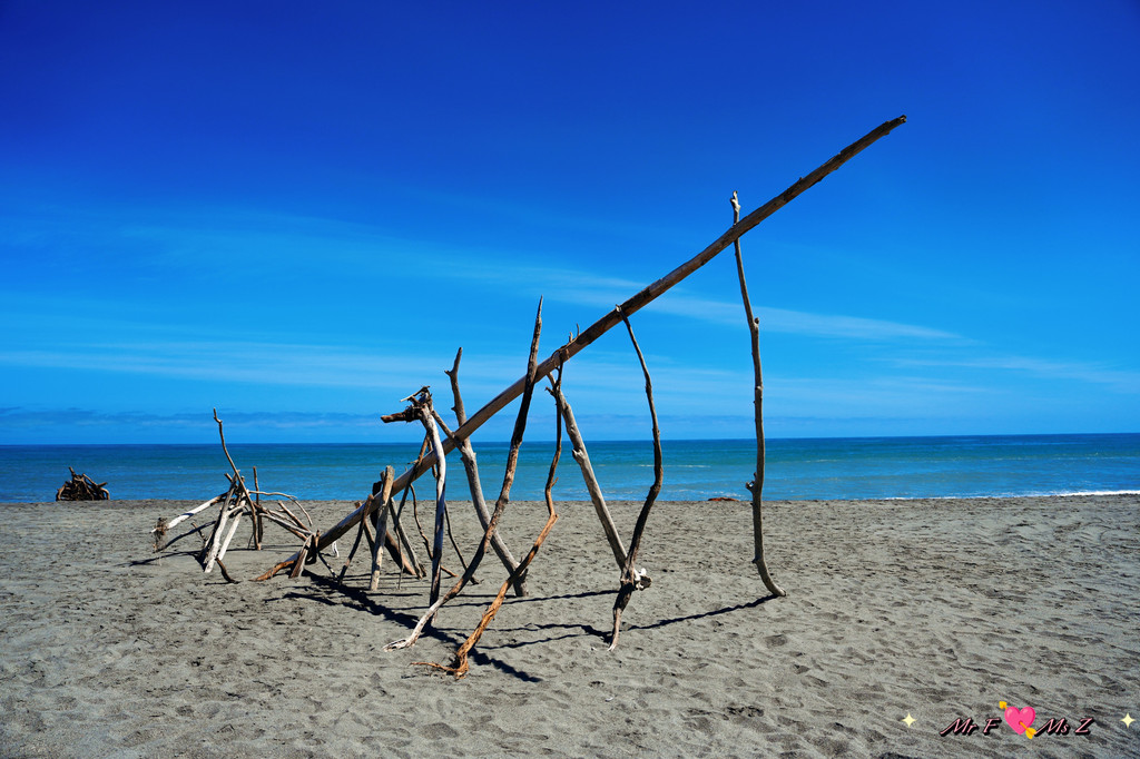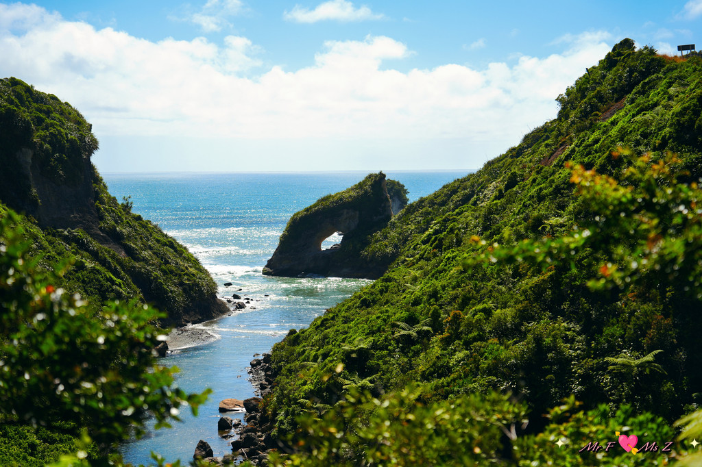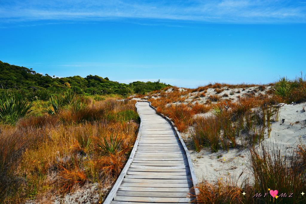 经过两小时的跋涉,我终于抵达了此行的终点——基恩角观景台(Point Kean Viewpoint)。这座造型独特的观景平台匠心独运地模仿了毛利传统独木舟(Waka)的形态,其视野之开阔远胜先前途经的两个观景台。平台上的解说板记载着这片土地、海洋与先民的故事。