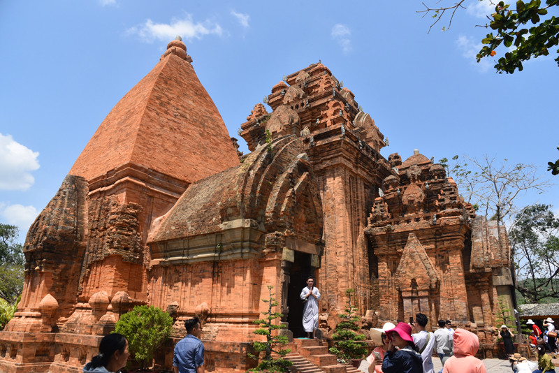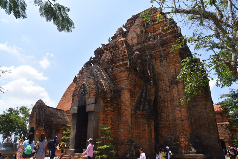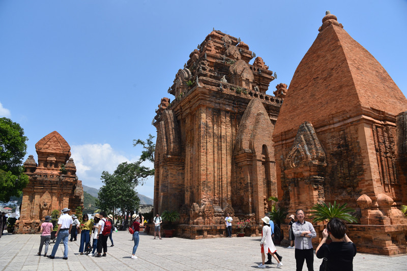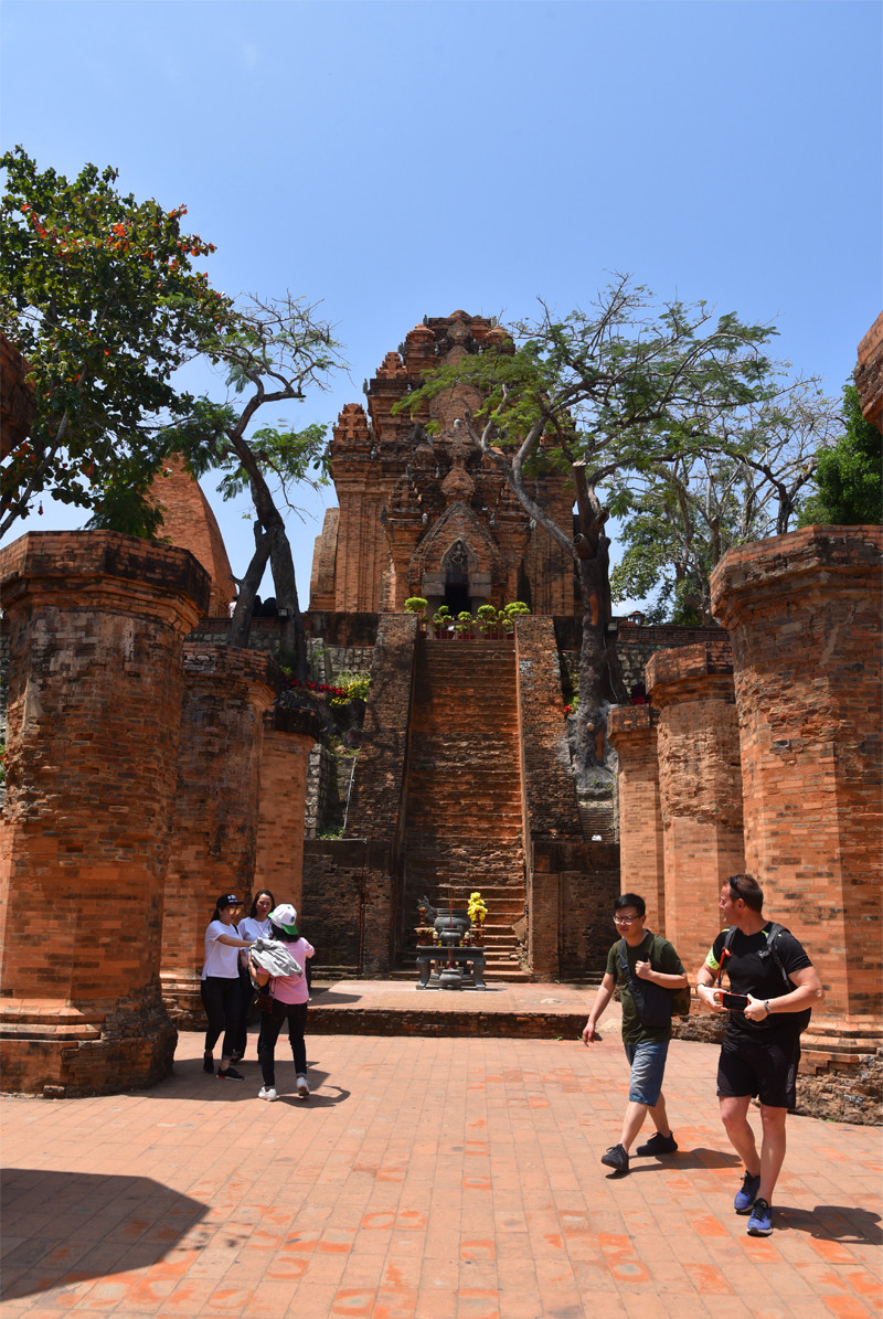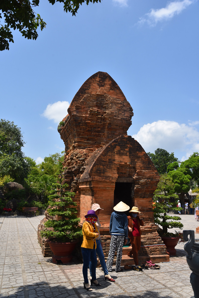 蓝天白云,绿树红塔,交相辉映十分引人注目。斑驳的建筑,风化的神像,残存着历史变化的痕迹。站在山顶上,俯瞰芽庄碧蓝的海港和错落的民居,有道是:近看占婆古塔,断壁残垣无史记;远观芽庄闹市,矮屋高楼隐春秋。