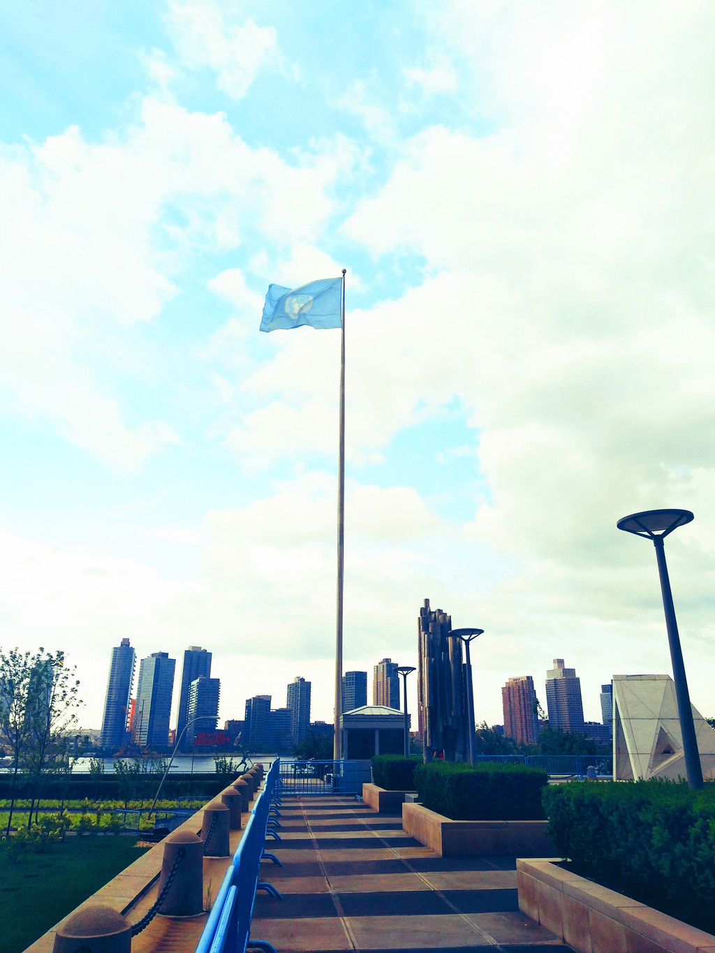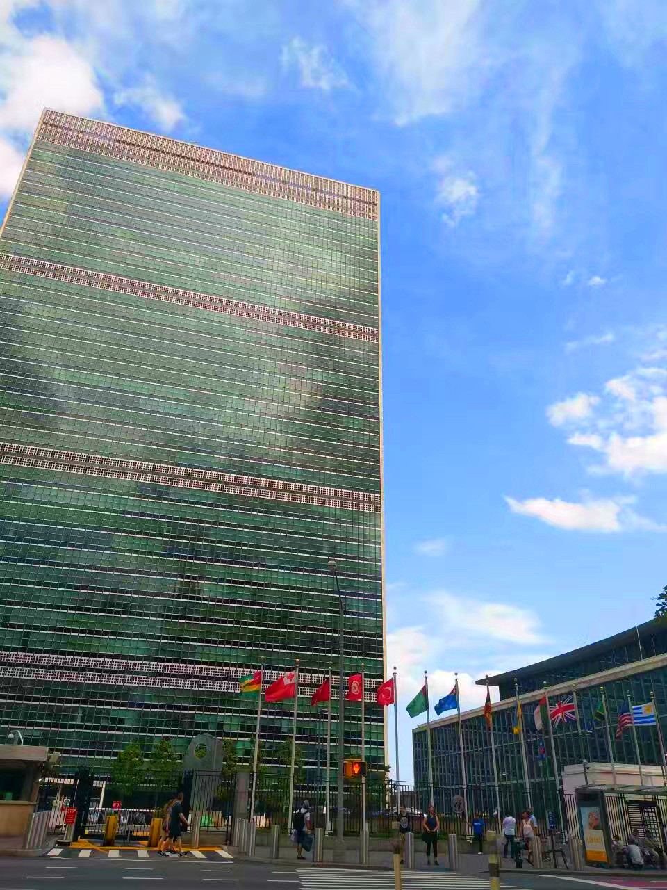 从中央车站出来,往哈德森河方向行驶20分钟,我们来到联合国总部。联合国总部的土地为国际领土,由秘书处大楼、会议厅大楼、大会堂和哈马舍尔德图书馆四栋建筑组成,外面旗杆上飘扬着多国国旗。我们作为联合国常任理事国的公民,到了纽约,去联合国总部打个卡很有必要。 经过预约,过安检,我们进入了联合国总部。