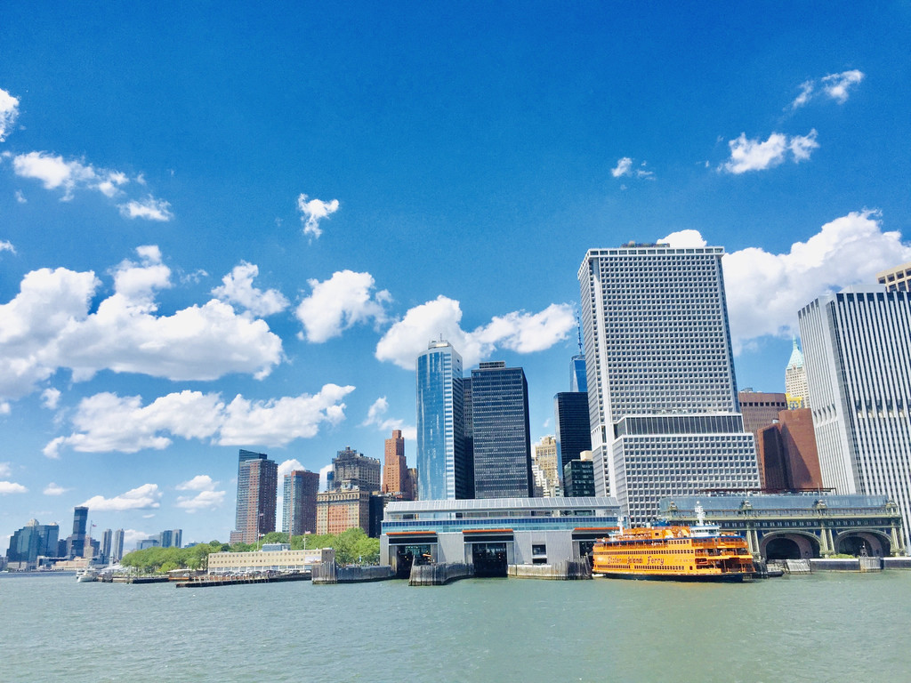 6月19日,阳光明媚,天气十分给力。我们一早从酒店打车到渡轮码头,希望在渡轮上远眺自由女神风采。自由女神像(Statue Of Liberty),是法国在1876年赠送给美国的独立100周年礼物,由法国著名雕塑家奥古斯特·巴托尔迪设计并制作,历时10余年,在1886年10月28日落成并揭幕。女神右手高举象征自由的火炬,左手捧着刻有1776年7月4日的《独立宣言》,脚下是打碎的手铐、脚镣和锁链,她象征着自由、挣脱暴政的约束。