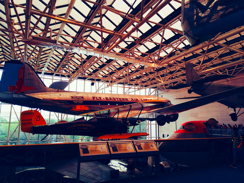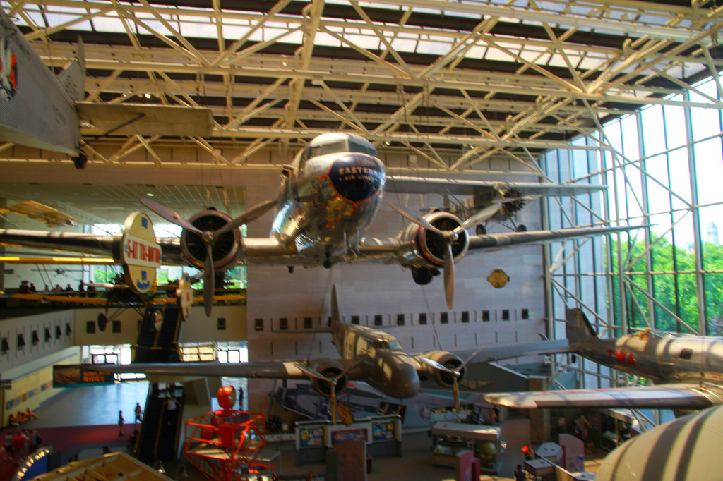 从国家艺术馆的艺术雕塑花园出来,步行一段距离,来到美国国家航空航天博物馆。美国国家航空航天博物馆汇集了大量具有里程碑意义的飞行器、太空探测器、导弹等,同时也是研究航空航天、行星科学、地球科学的历史和科学研究中心。进入博物馆,可以看到蒙特哥菲尔兄弟飞越巴黎上空的热气球复制品,还有出自莱特兄弟之手的世界第一架飞机“飞行者1号”,阿波罗11号第一次登月的登月舱“哥伦比亚号”,这里记载了人类飞行史的每一个脚印。这里还有各种飞行器的真机展示,全馆共有真机265架,这里深受航空航天爱好者的喜爱和追崇。不过我家小荳妞,除了坐了一会儿飞机,貌似对这些高科技不太感兴趣。