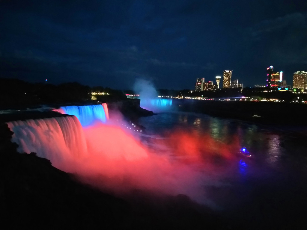上了岸,我们步行到公羊岛公园,从瀑布上方近距离欣赏一下美国瀑布和新娘瀑布,美国瀑布虽然没有尼亚加拉瀑布大,但也非常震撼,而新娘瀑布则宛如一位温婉可人的新娘,娇小美丽。天色慢慢黑了下来,夜晚的瀑布在不同颜色灯光照射下,犹如五彩斑斓的水幕,亦幻亦真,散发出迷人的魅力。