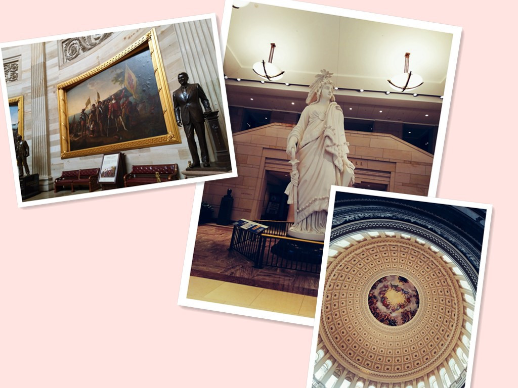 从美国国家航空航天博物馆出来,立即赶去国会大厦。美国国会大厦,1793年9月18日由华盛顿总统亲自奠基,是美国众参两院的办公大楼,是美国民有、民治、民享政权的最高民主象征。这里是美国历届总统就职典礼举办地,也是美国总统宣读年度国情咨文场所,这里还是美国国父华盛顿长眠之地。有机会走进这座庄严宏伟的建筑,亲眼目睹美国的民主,我们深感荣幸。不过,非常遗憾,国会大厦导游全程英文解说,我们基本上是不知所云,只能靠自己慢慢琢磨。