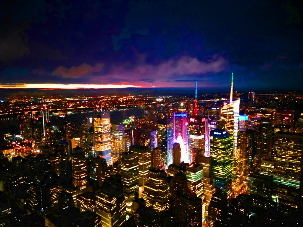 来到帝国大厦,你根本感觉不到这是一座快百年历史的建筑,外观干净漂亮、内部整洁如新。我们坐上高速电梯,电梯很快就到达了86层,夜幕下的纽约更加迷人,五颜六色的灯光像流动的花朵在城市上空开放,整个纽约到处都是灯火璀璨,不过观景台上面风很大。