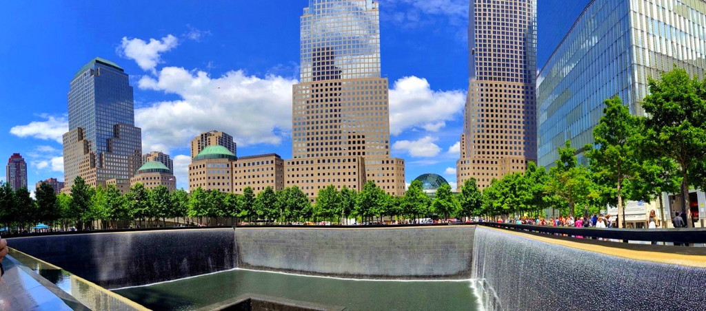 离开华尔街,我们来到归零地——就是纪念911的一座公园。为了纪念911逝去的生命在世贸大厦双子塔原址各建了一个水池,水池的四壁徐徐留下细细的水流,似乎在为逝去的生命流下叹惋的眼泪,水池围栏上刻着灾难中丧失生命的无辜者的姓名。虽然天空阳光灿烂,此情此景,我们内心依然酸楚和难受,但愿世界和平,不再有这种灾难性悲剧发生!