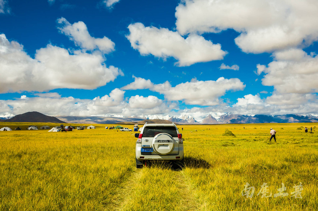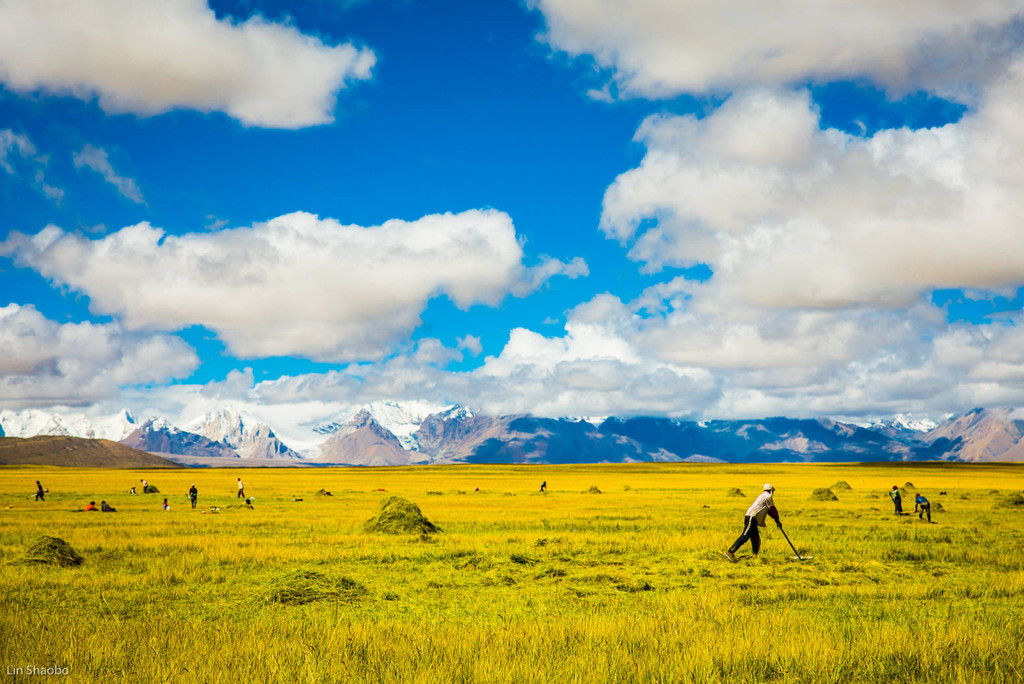 将车开到中间与藏民们一起玩耍,牧民们在打草,准备越冬的牲畜草料,他们累了喜欢和你聊聊天,不太标准的普通话挺有意思。