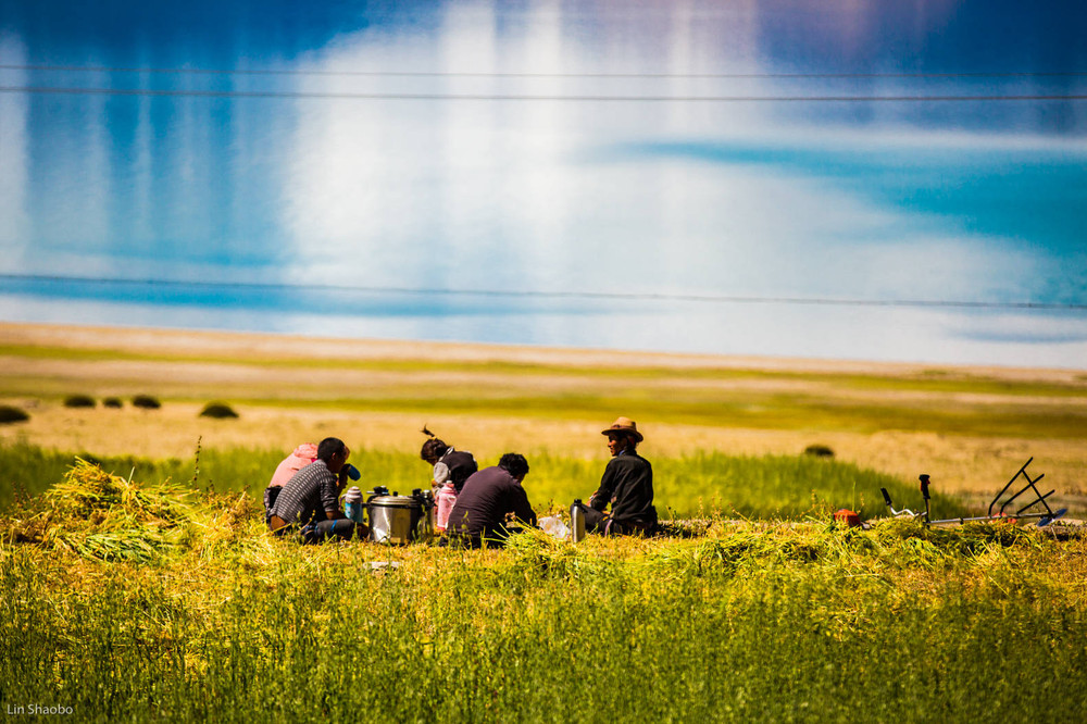 湖岸一些小块晚熟的青稞地,牧民们收割、歇息,和他们坐在岸边望一望彩色的湖和希夏邦马雪山,或许这是青藏高原最美的秋收。