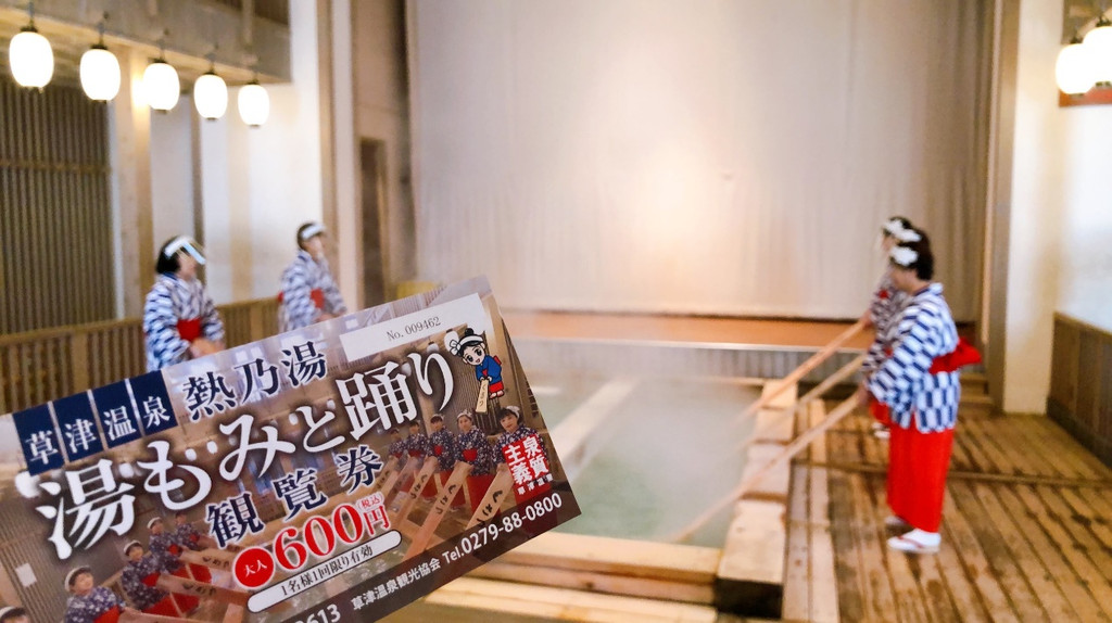 草津温泉据说可以治疗所有的疾病,除了恋爱病。 这里有100多个自然形成的大大小小的温泉。以喷出蒸汽温泉场流出、形成水流注入西边的河道和露天浴场。还能饱览通过浸泡和旋转木板来冷却泉水,随着民谣的节奏搅拌泉水的汤揉舞表演。