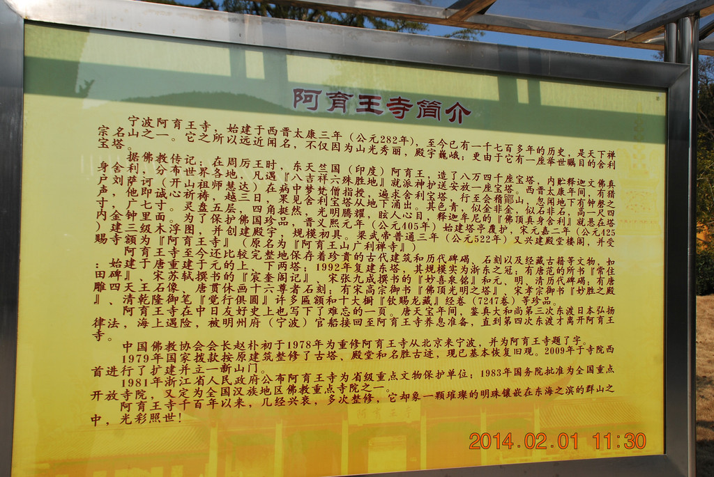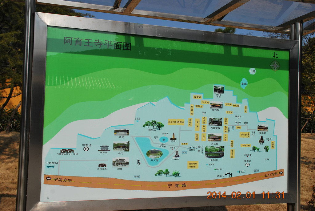 2014年春节,我们一家前往宁波和舟山自驾游。这是我迄今以旅游为目的第七次来到宁波,一是宁波值得深度游的景点非常多;二是自驾游游宁波可顺带免费过跨海大桥去舟山沈家门看看;三是新年祈愿值得再去阿育王寺、天童寺、七塔寺等名刹。尽管出游前得知浙江连续发生H7N9禽流感,其中宁波的发病较多,但我们对游程安排没有产生犹豫。此行比较满意的是,节日期间的酒店住宿普遍大幅涨价,但我们提前预定锦江之星的门店,拿到了每晚仅100元的标房体验价,住3晚总共才花费300元。另外,阿育王寺、天童寺今年起改为免费景点,使我们此行的门票花费仅为每人5元。如此住宿、门票费用实惠的旅游,应该感谢宁波人擅于经商而没有掉入“铜钱眼”里。