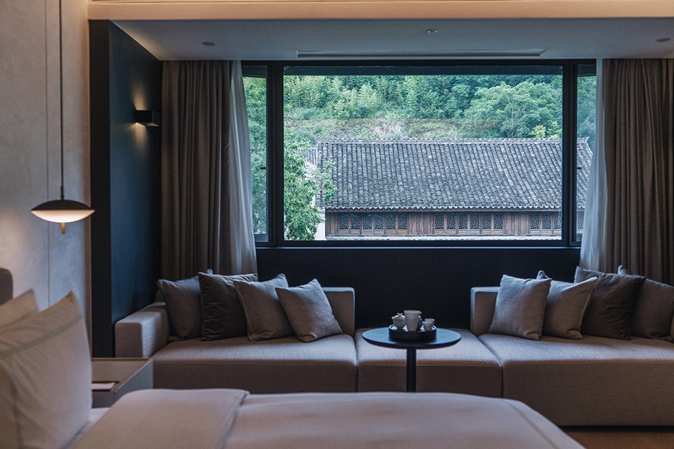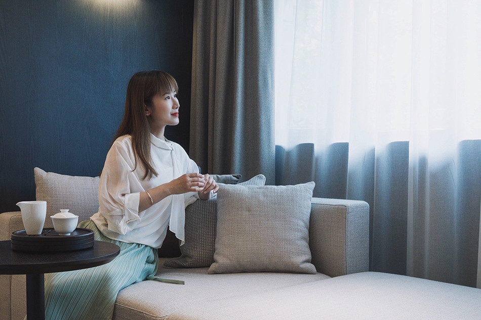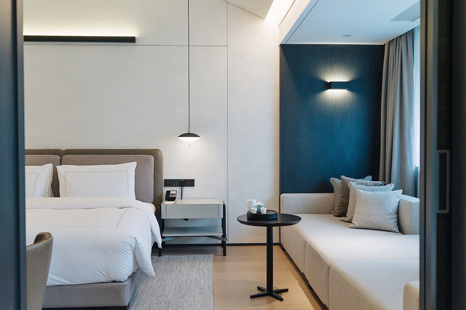 JUN酒店是三进院子的宅院,一共只有23间客房。房间是主打灰白蓝低饱和度的莫兰迪色调,和酒店整体色调相得益彰。床品和浴袍是众多皇家贵族御用的意大利品牌芙蕾特,洗漱用品是爱马仕,吹风机则是戴森的。每间房间的mini bar都是免费的,炎热的下午在房间可以沏茶休憩,伴着窗外的知了声好不自在。