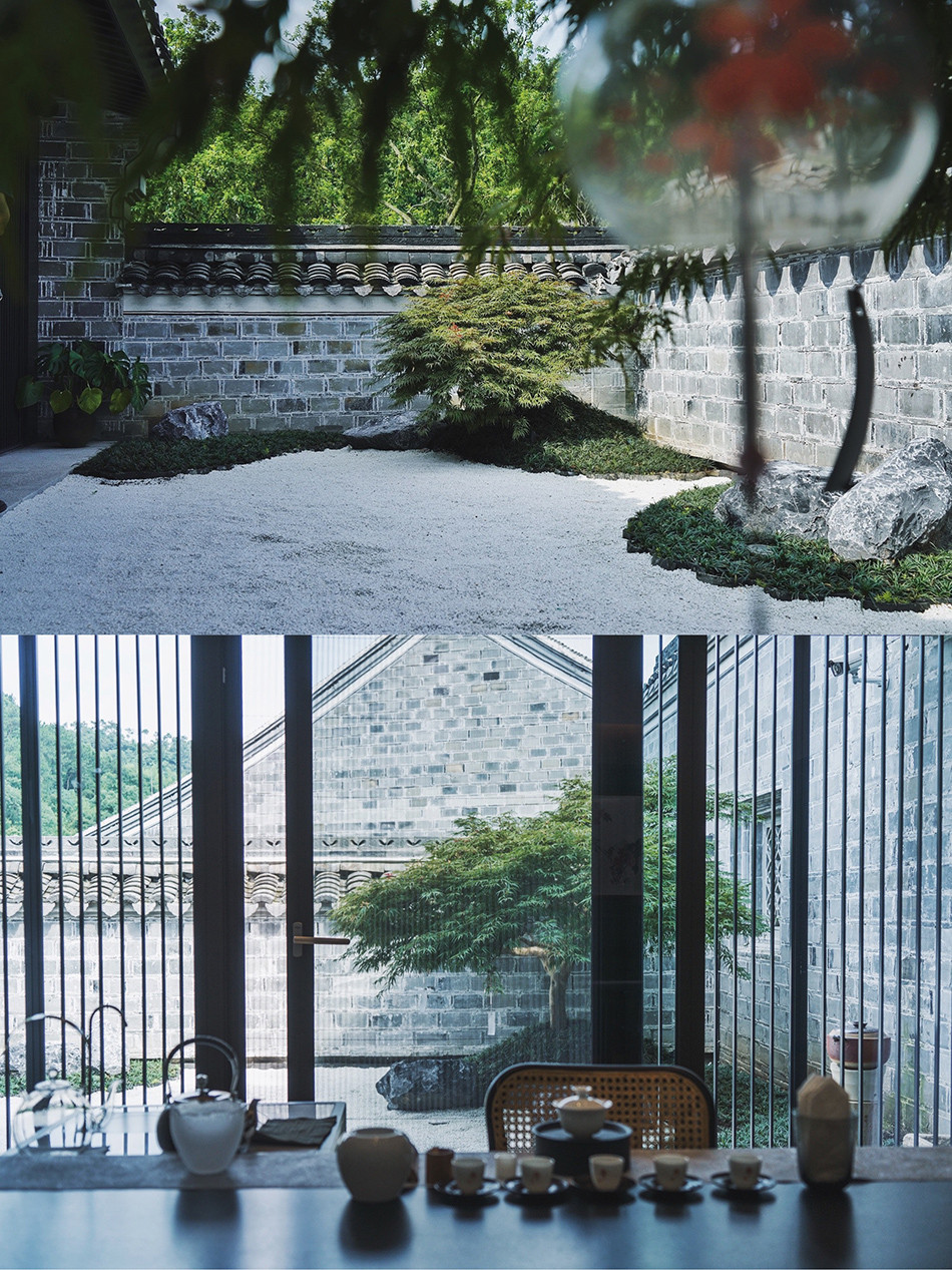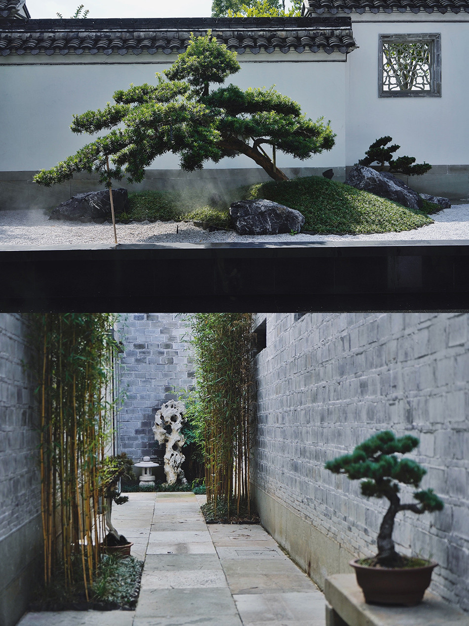 穿过石屏风、竹影,映入眼帘的是枯山水园林,松石流水、黛瓦白墙,移步换景。