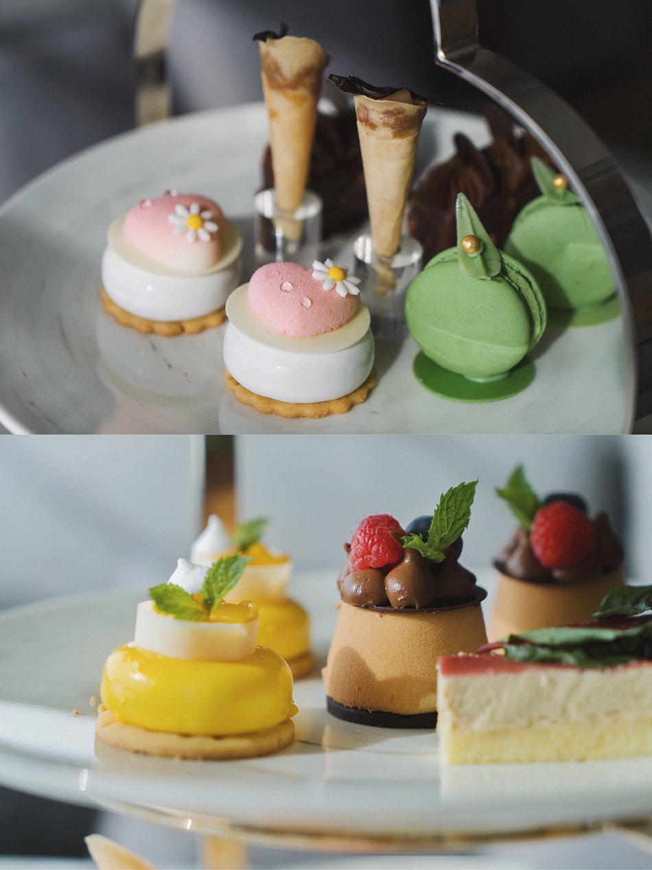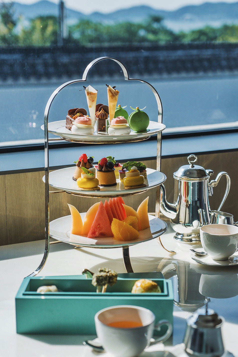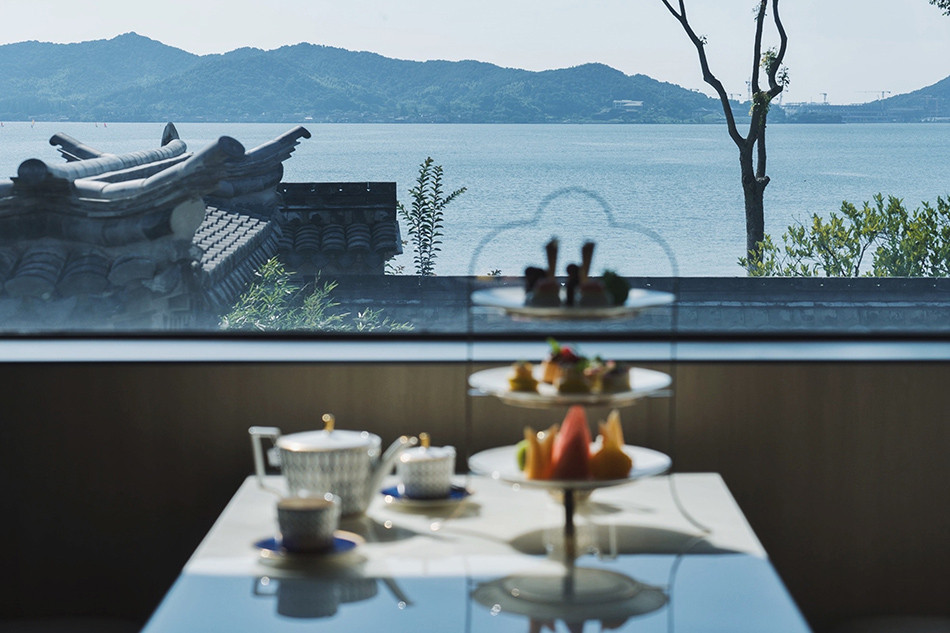 宁波东钱湖JUN酒店二楼有个湖景下午茶,一壶茶配11道点心。甜点有经典的费列罗榛果巧克力蛋糕、草莓白巧克力慕斯蛋糕、宇治抹茶马卡龙等;咸点有黑松露鹅肝冻、龙井茶香豆沙蛋黄酥和岭南多味牛肉粒等几款。天气不热的时候可以坐在露台上,观远山近黛,开启浪漫的东钱湖下午茶时光。