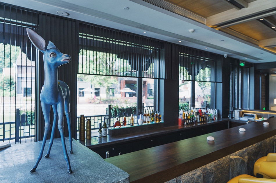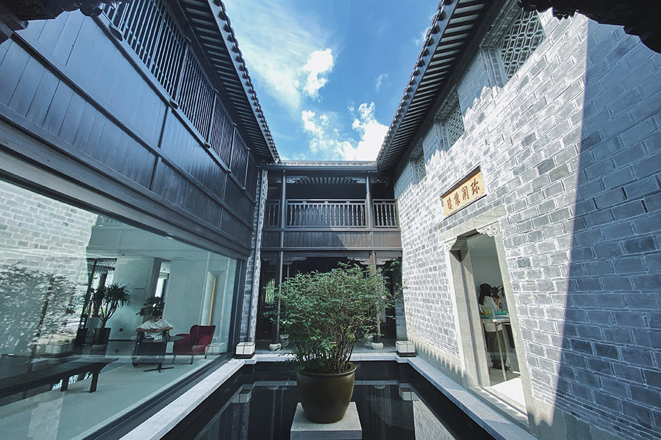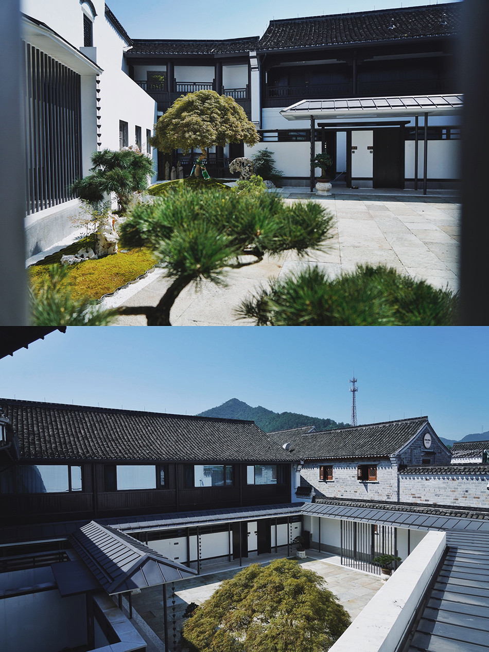 我个人最喜欢的是酒店的新中式庭院,由中央美院设计,非常出片。羽毛枫、太湖石、盆景松树、青苔、石雕,这些布局并入了意蕴深厚的东方美学。新中式庭院区别于日式庭院的特别之处,在于建筑与人的相通。庭院对于我们国人不只是一座住宅,更是一种生活方式。