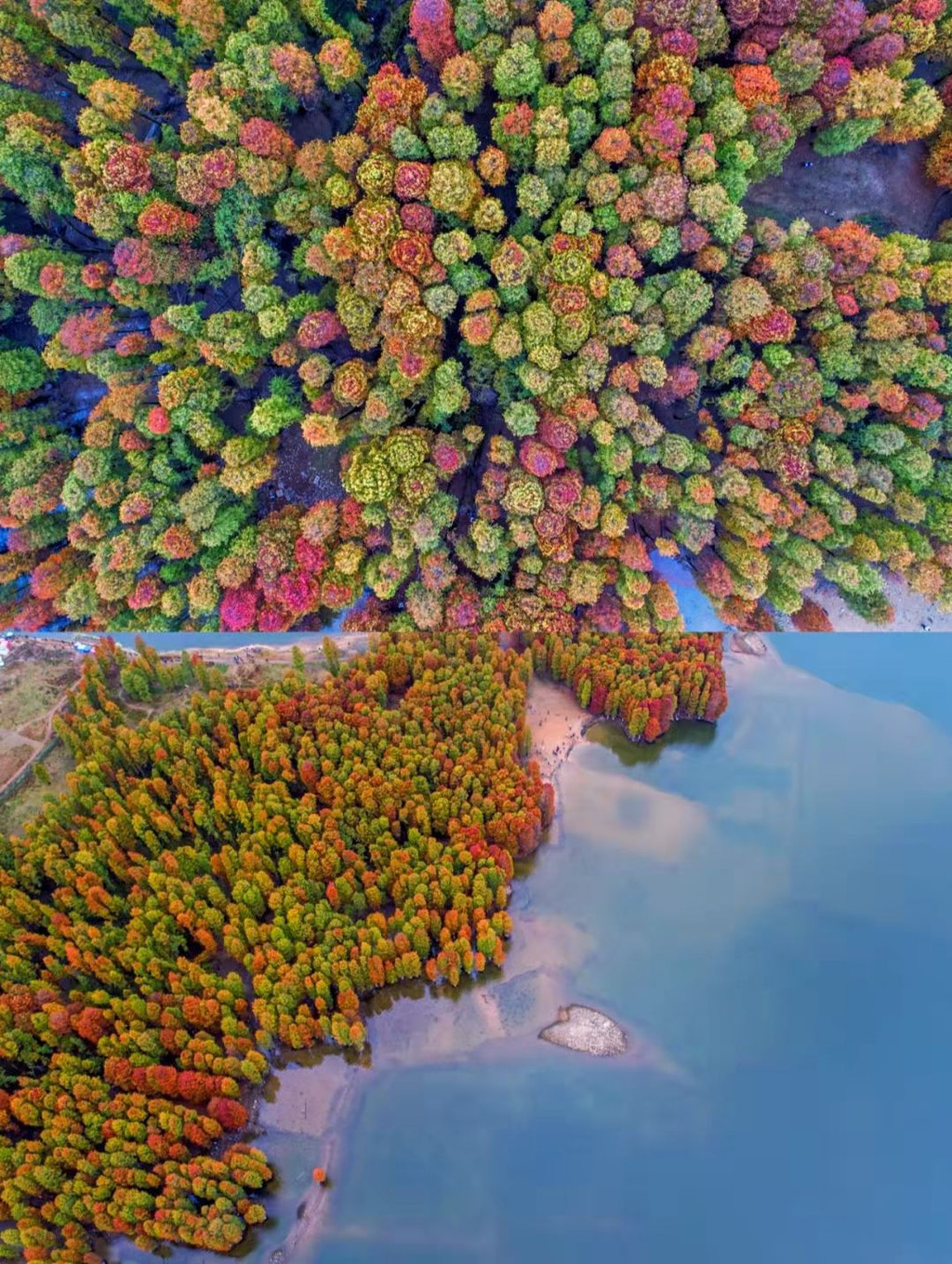 大片大片的水杉如红色的纱巾笼在湖面与湖岸上,与绿色的湖水相映成趣。走进水杉林中,如同步入红色的丛林秘境,很适合拍照📸