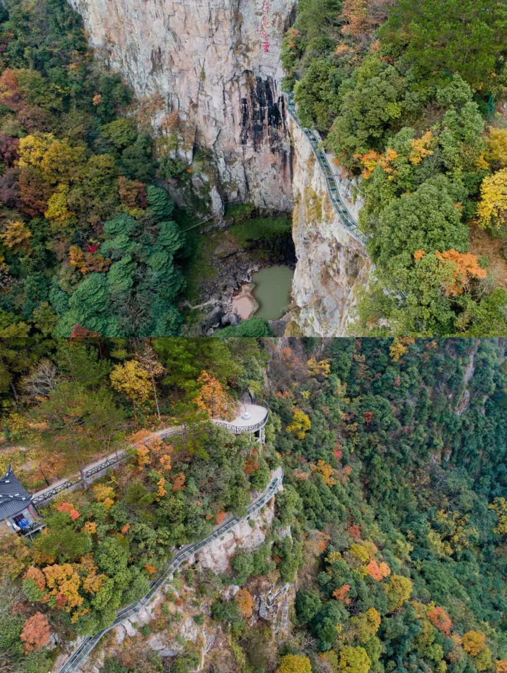 在瀑布两侧的山壁上,分别是飞拉达攀岩与玻璃栈道