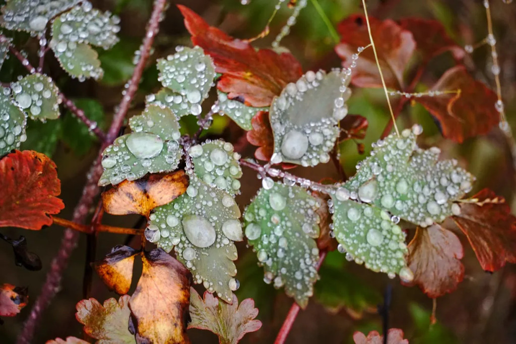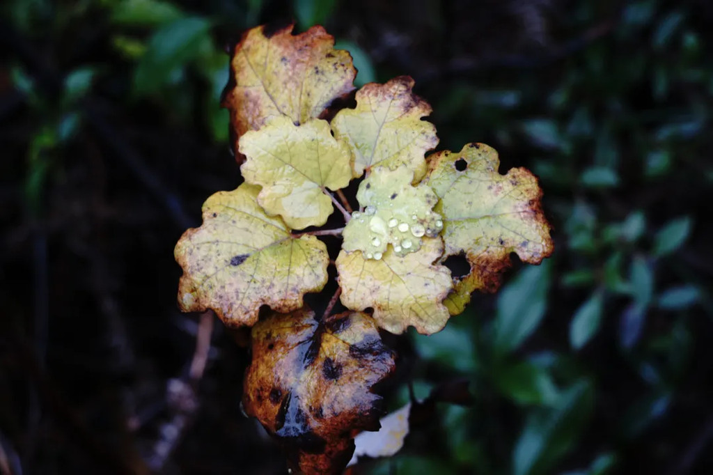 滴着雨的树叶,看着就像飞蛾的翅膀。这是一棵我不了解其名字的树。