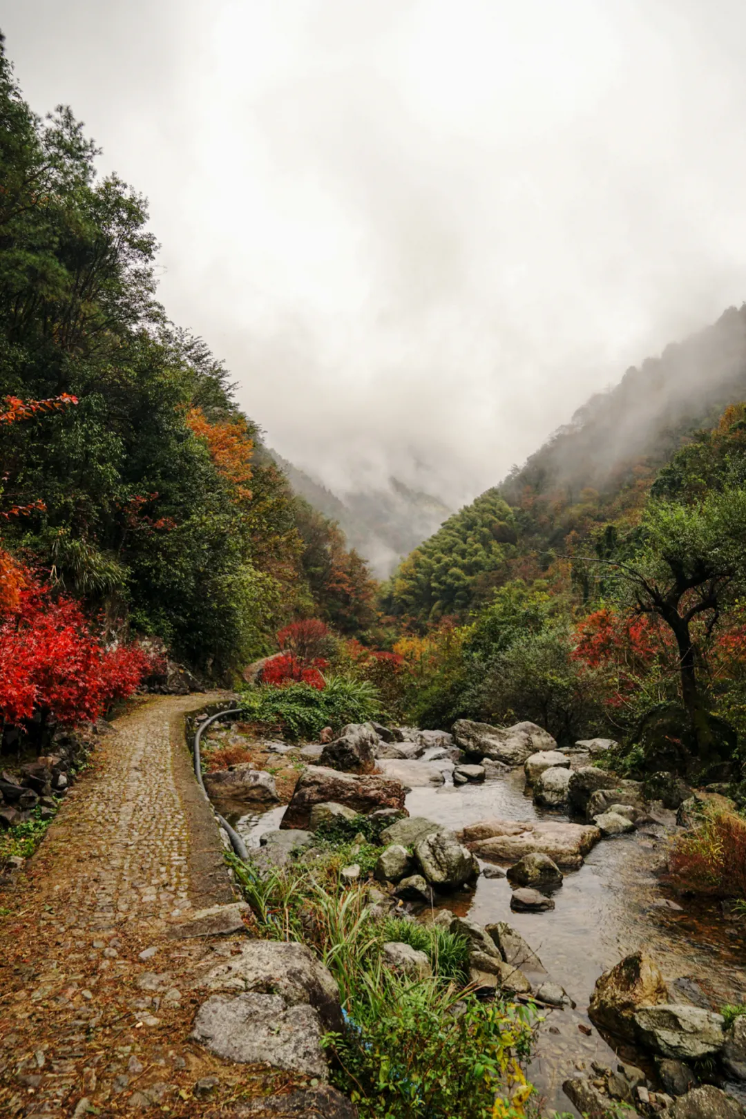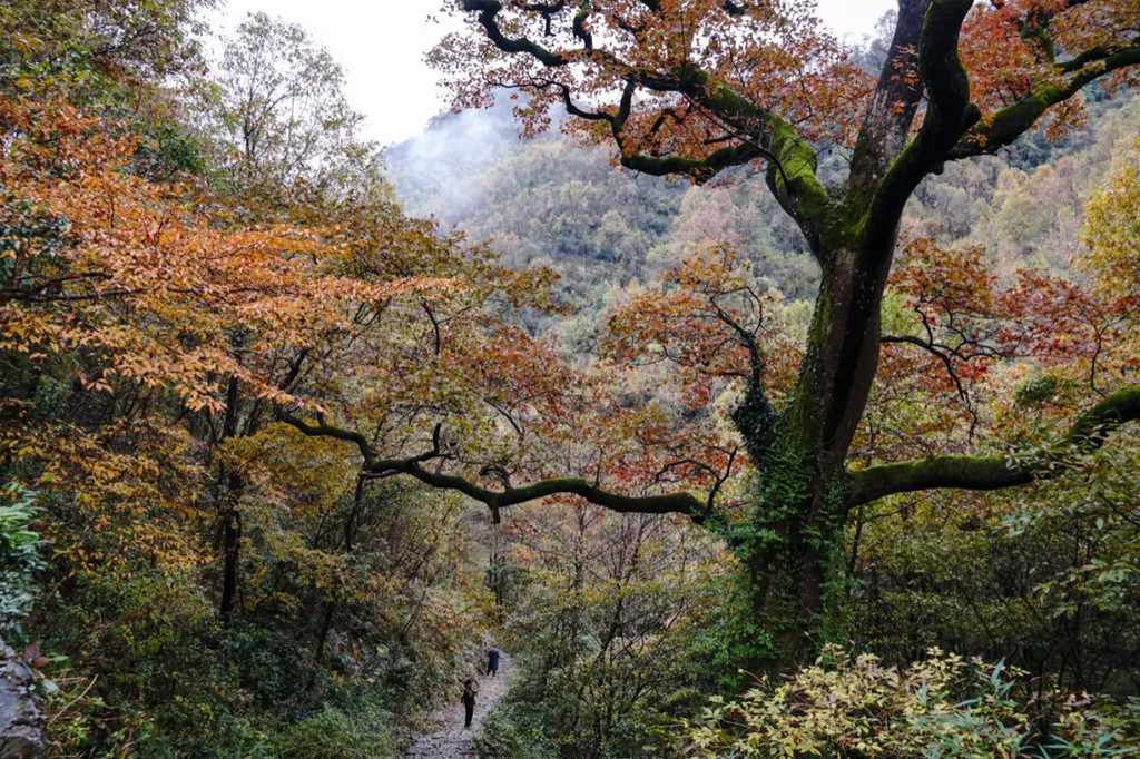 据说四明山群中有成千棵、几千棵的枫树,秋冬季节颜色变幻很是美丽。换做是栖霞坑古道在壶潭村的那一头,遍山的红枫则是“黄金大道”的景观,这也是我后来知道的。