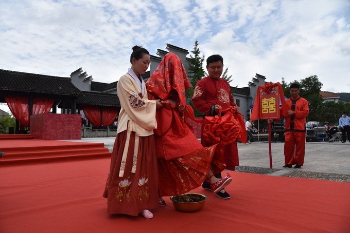 “一条红丝绸,两人牵绣球,月老定三生,携手踏锦绣……”婚礼仪式在悠扬的古琴声中拉开序幕,一对对新人手牵红绳款款而来,跨火盆,踩米袋,踏瓦片,寓意着幸福生活红红火火、代代相传。