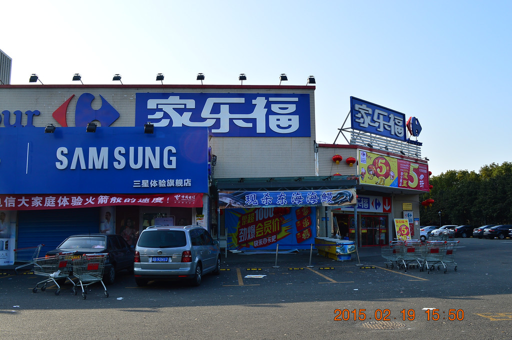 节日期间的家乐福仍营业,但顾客不多。我们买了些海产品。