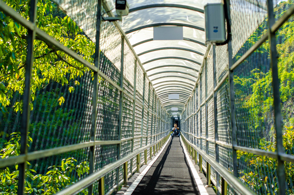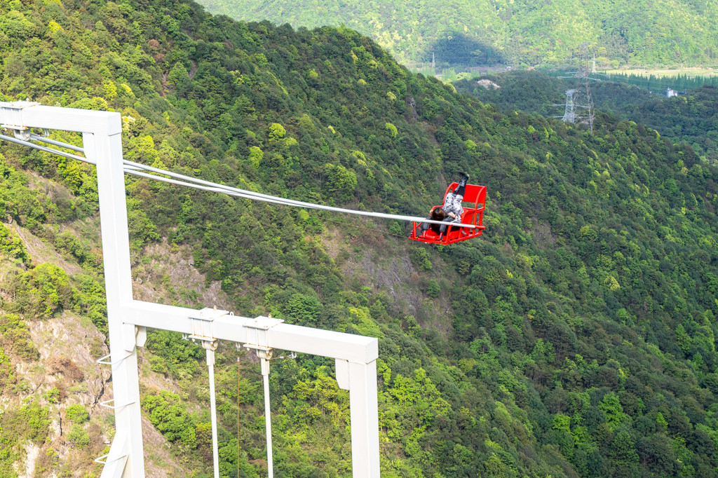桥全长达200米左右,悬空的桥身150米,离地高度超200米,是由铁索和多块巨大透明玻璃搭建而成。风和日丽之时踏在玻璃桥上,梁皇山谷的美景尽收眼底。不过对于恐高的朋友来说,从60多层楼高向下俯视真的是一个大大的考验。但是游客们大可放心,这里的安全系数很高,如果你不想错过这美景,一定要来这走一走。