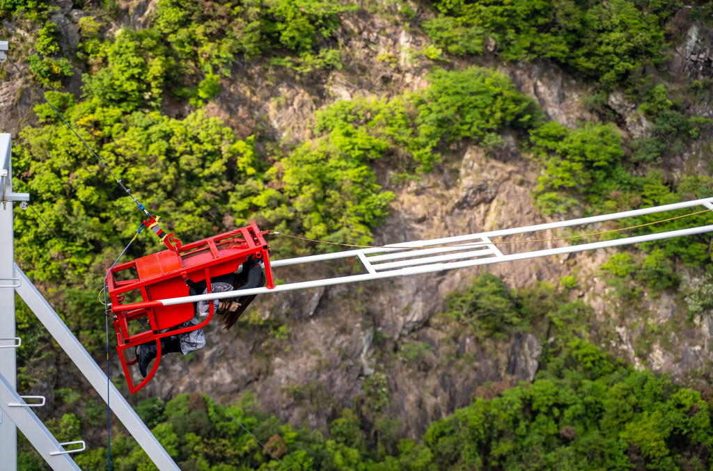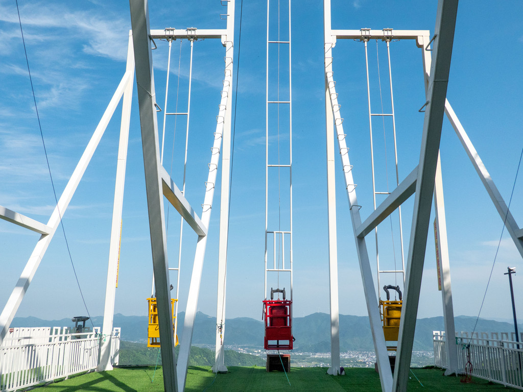 在同伴们的鼓励下,壮起胆子上去挑战一下胆量。系好安全带,座椅在磁铁的吸引下慢慢上升,到最高点时距离地面已经有三四层楼的高度。最刺激的是磁铁刚刚松开的一刻,在重力加速度的作用下仿佛被砸向地面,又被绳索牵引抛向空中,顿感血脉喷张,但是也就在那被抛向最高点的那一刻,一声呐喊,回荡在山谷之间,确实很爽。