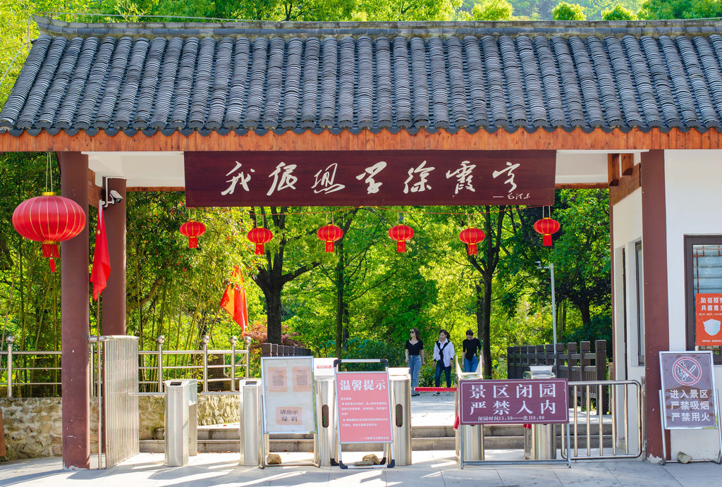 下车径走小段路以后,你便能看到高耸的白色牌坊,“梁皇山”三个大字遒劲有力的出现在你面前。从山门沿蜿蜒山道入内,不远处便是景区大门,检票口上方还有伟人提笔的大字牌匾横挂在门口。