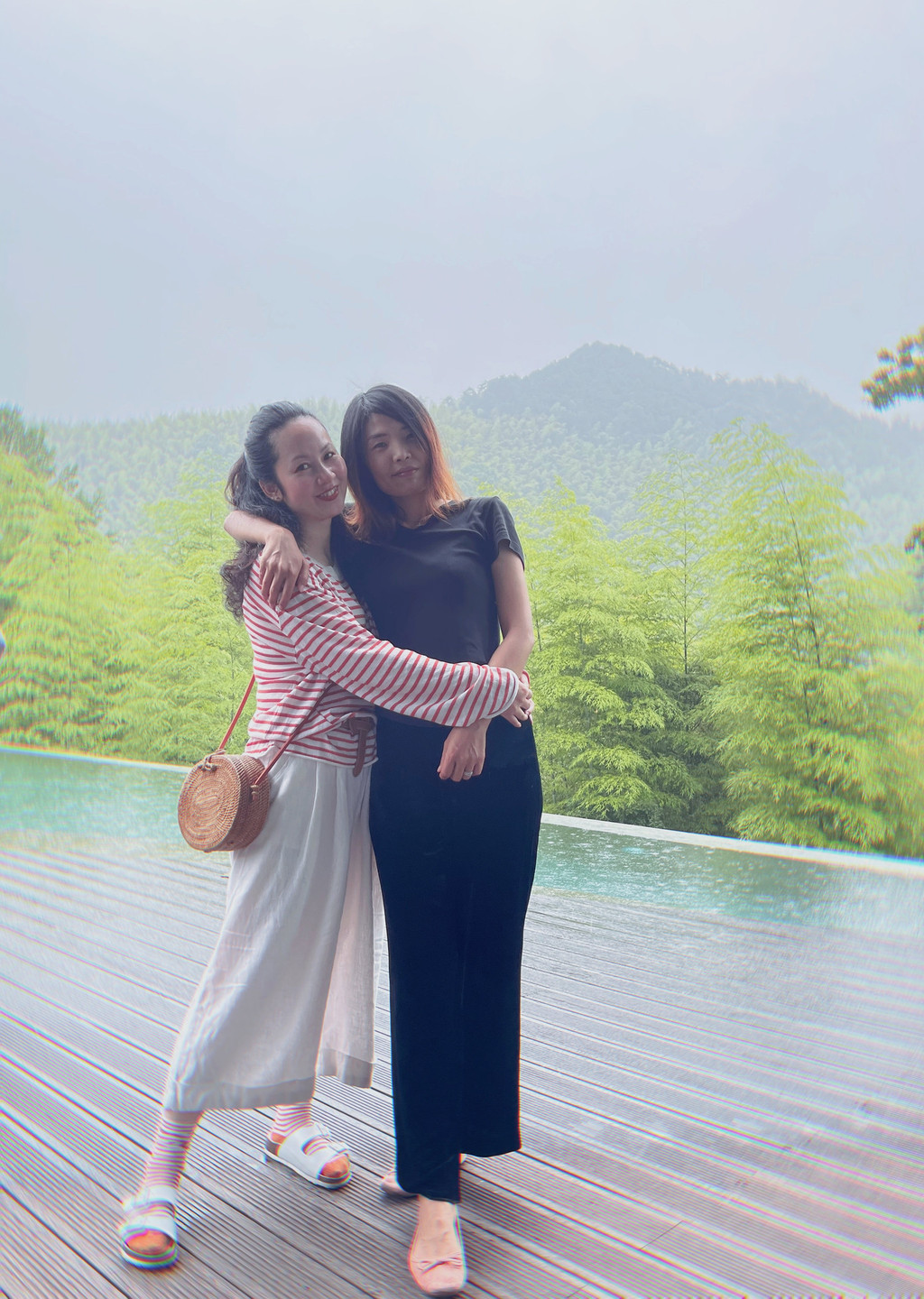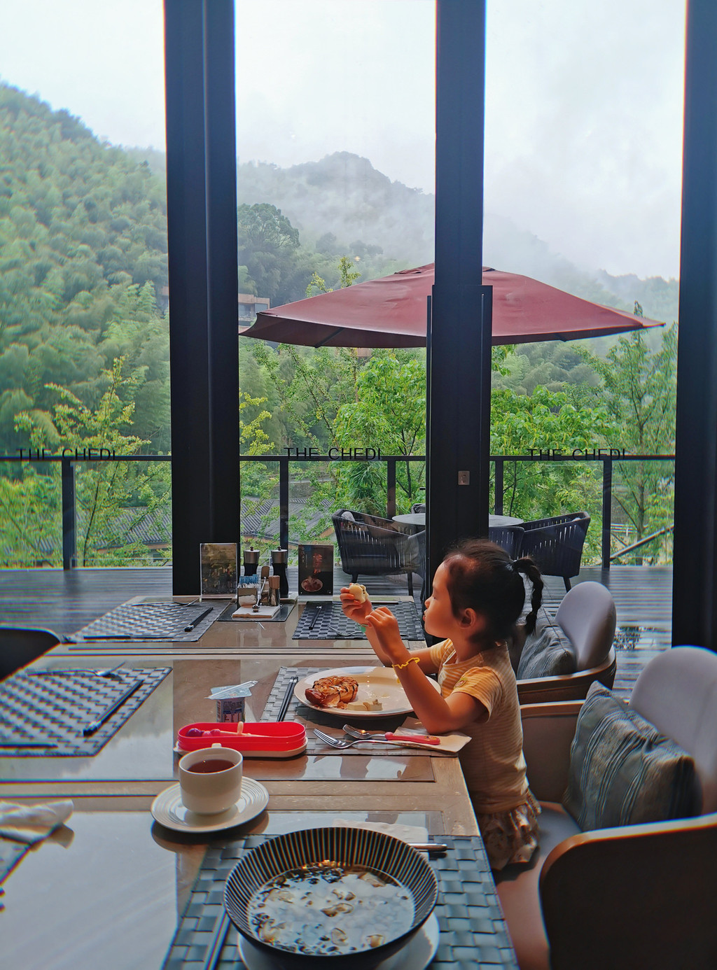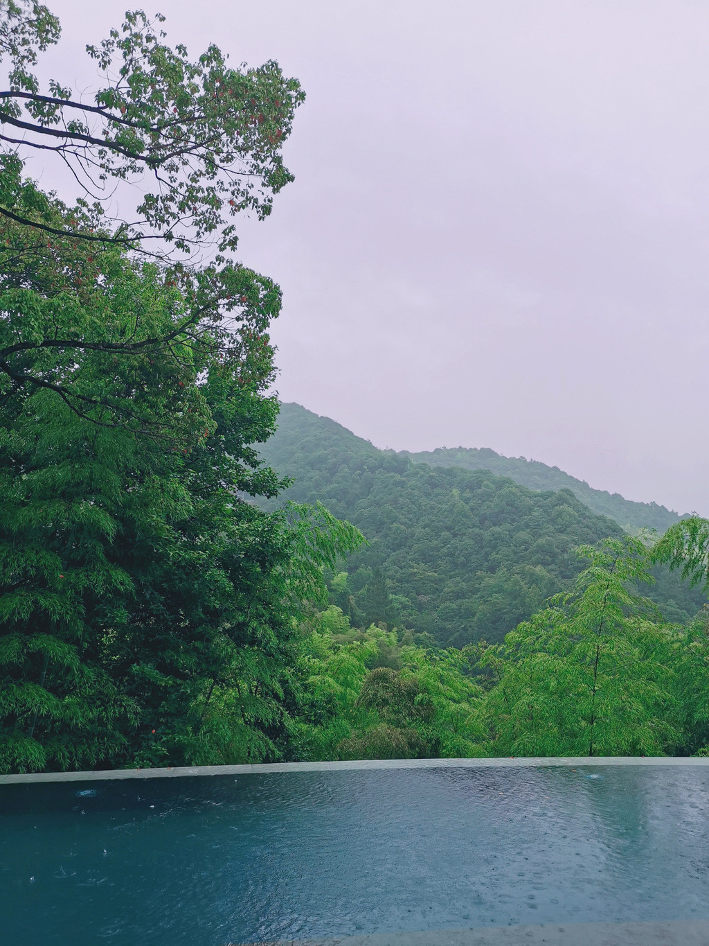 第三日早餐后,爸爸带着玥去玩了,我们仨从餐厅雨中漫步到天际泳池。