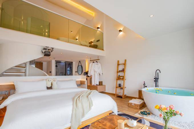 LOFT家庭套房,瘫倒在床上,思绪放空,透过窗户望向蔚蓝的天,想到夜晚满天星辰作伴入眠,一定别有滋味。