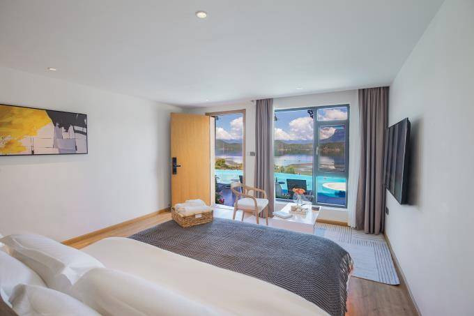 酒店有多种房型:每间客房的主题都颇有意境,从房间内往外看,近180度的落地窗可以看见高山耸立,湖上美景。