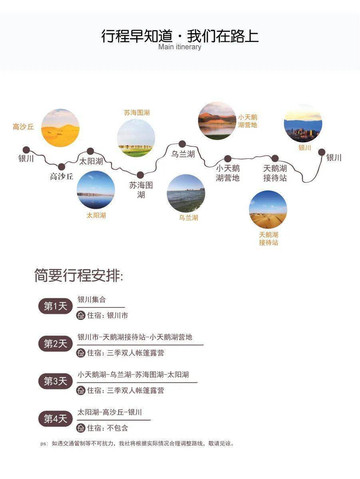 中午12:00左右全部出沙,正常情况下,17点前均可抵达银川,结束行程,大家可以预定晚上19:00之后的火车票或者飞机票返程。愉快的旅程就这样结束了,大家返程路上注意安全!