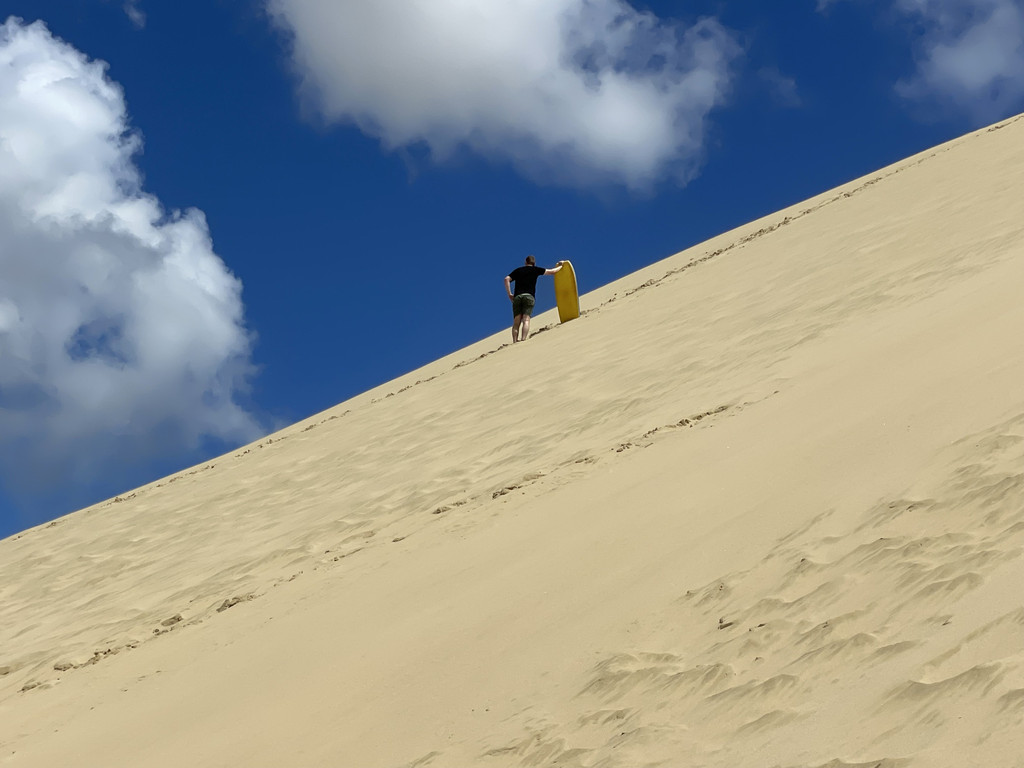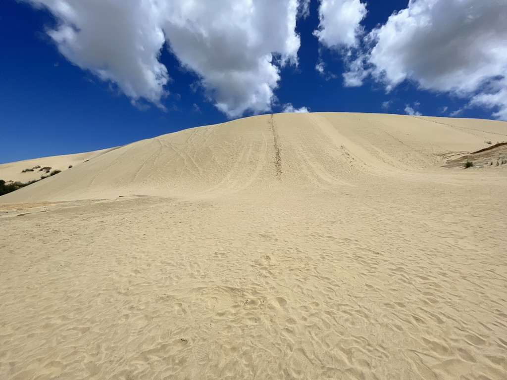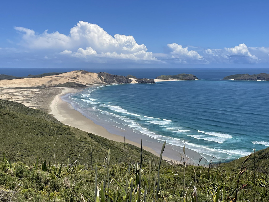 然后去Giant Sand Dunes,没想到新西兰有如此巨大绵延的沙丘,不过仔细观察,好像细细的沙子里有贝壳状的物质,因此有理由猜测高大的沙丘是海滩隆起形成的。Ninety Mile Beach,车载地图和Google地图都指错了路,白白地跑错两个入口;孩子已经没有信心了,在我的坚持下,走了第三条路,终于成功。九十英里海滩名不虚传,是我见过的最壮阔的海滩,即使跑错几趟路,感觉还是值得的。